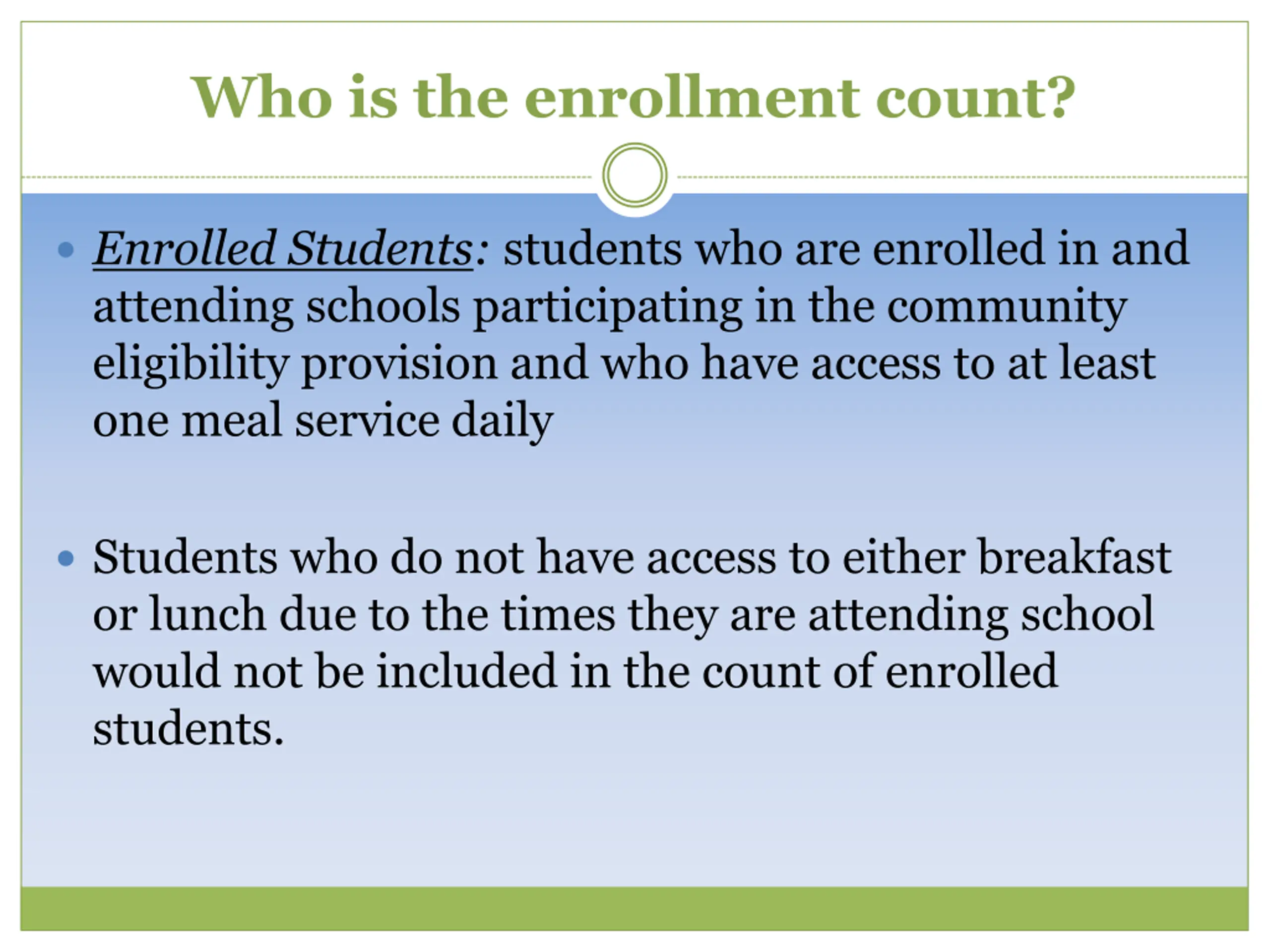 Who is the enrollment count? Enrolled Students: students who are enrolled in and attending schools participating in the community eligibility provision and who have access to at least one meal service daily Students who do not have access to either breakfast or lunch due to the times they are attending school would not be included in the count of enrolled students.