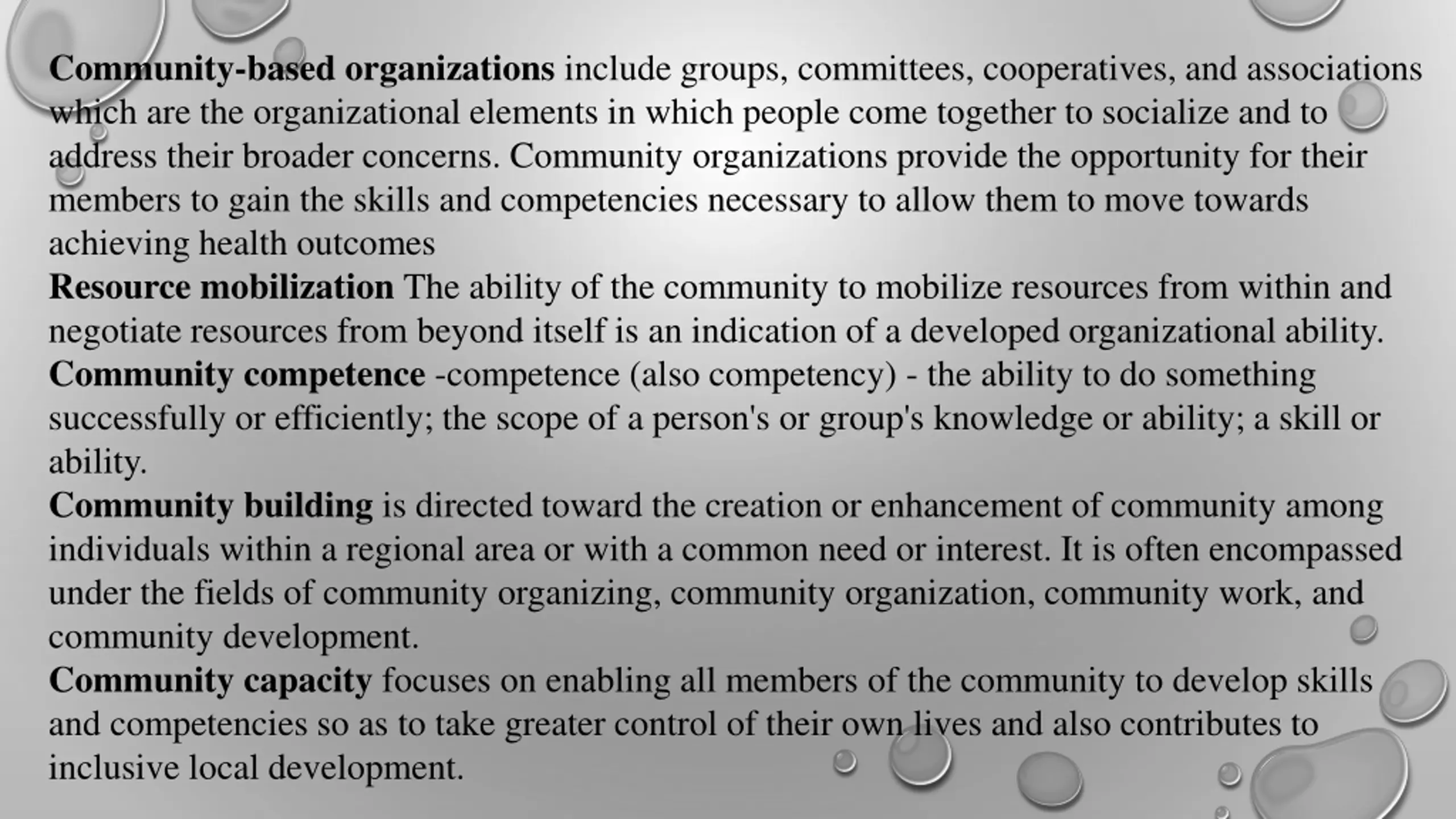 Community-based organizations include groups, committees, cooperatives, and associations which are the organizational elements in which people come together to socialize and to address their broader concerns. Community organizations provide the opportunity for their members to gain the skills and competencies necessary to allow them to move towards achieving health outcomes Resource mobilization The ability of the community to mobilize resources from within and negotiate resources from beyond itself is an indication of a developed organizational ability. Community competence -competence (also competency) - the ability to do something successfully or efficiently; the scope of a person's or group's knowledge or ability; a skill or ability. Community building is directed toward the creation or enhancement of community among individuals within a regional area or with a common need or interest. It is often encompassed under the fields of community organizing, community organization, community work, and community development. Community capacity focuses on enabling all members of the community to develop skills and competencies so as to take greater control of their own lives and also contributes to inclusive local development.