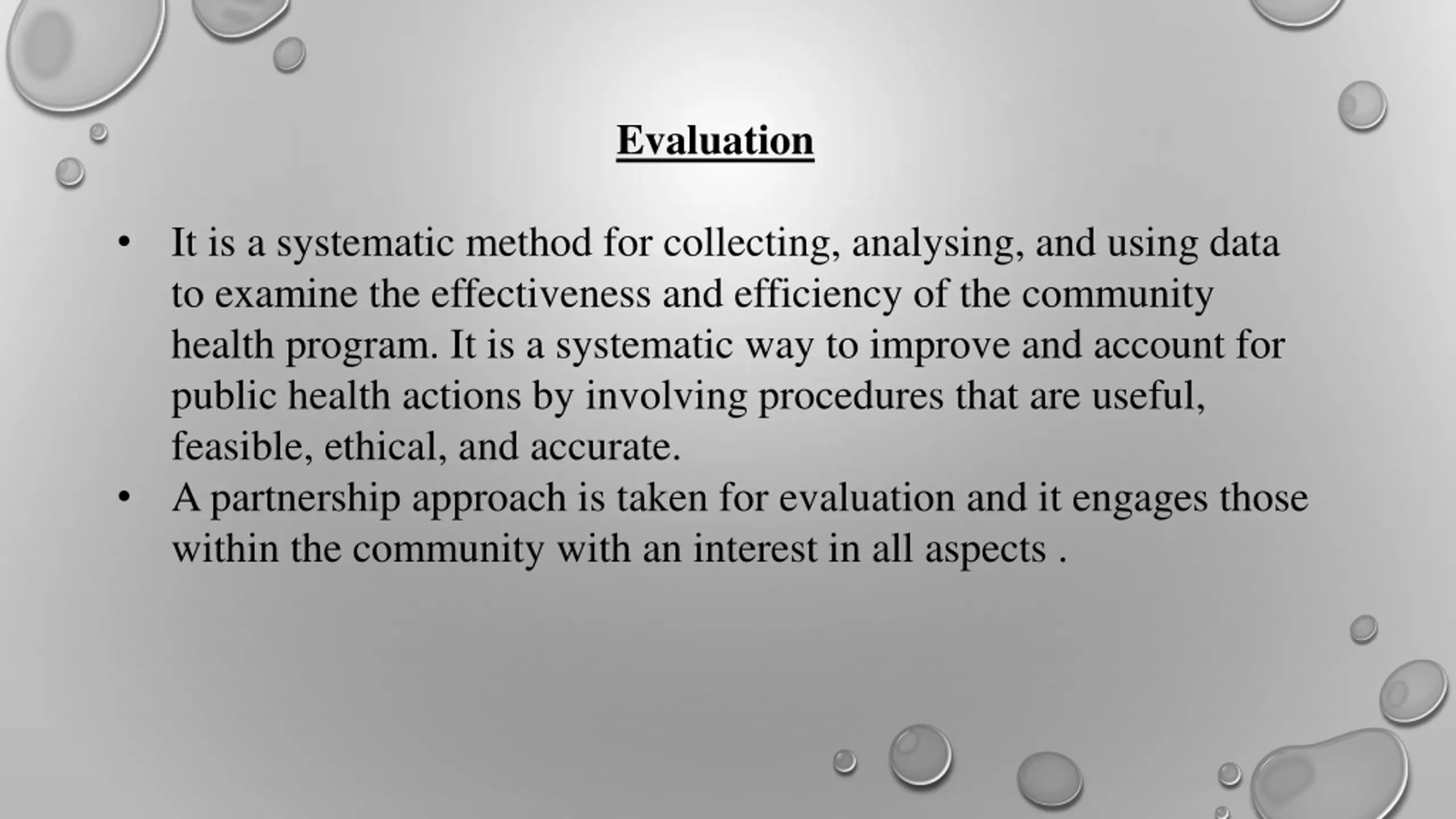 Evaluation It is a systematic method for collecting, analysing, and using data to examine the effectiveness and efficiency of the community health program. It is a systematic way to improve and account for public health actions by involving procedures that are useful, feasible, ethical, and accurate. A partnership approach is taken for evaluation and it engages those within the community with an interest in all aspects .