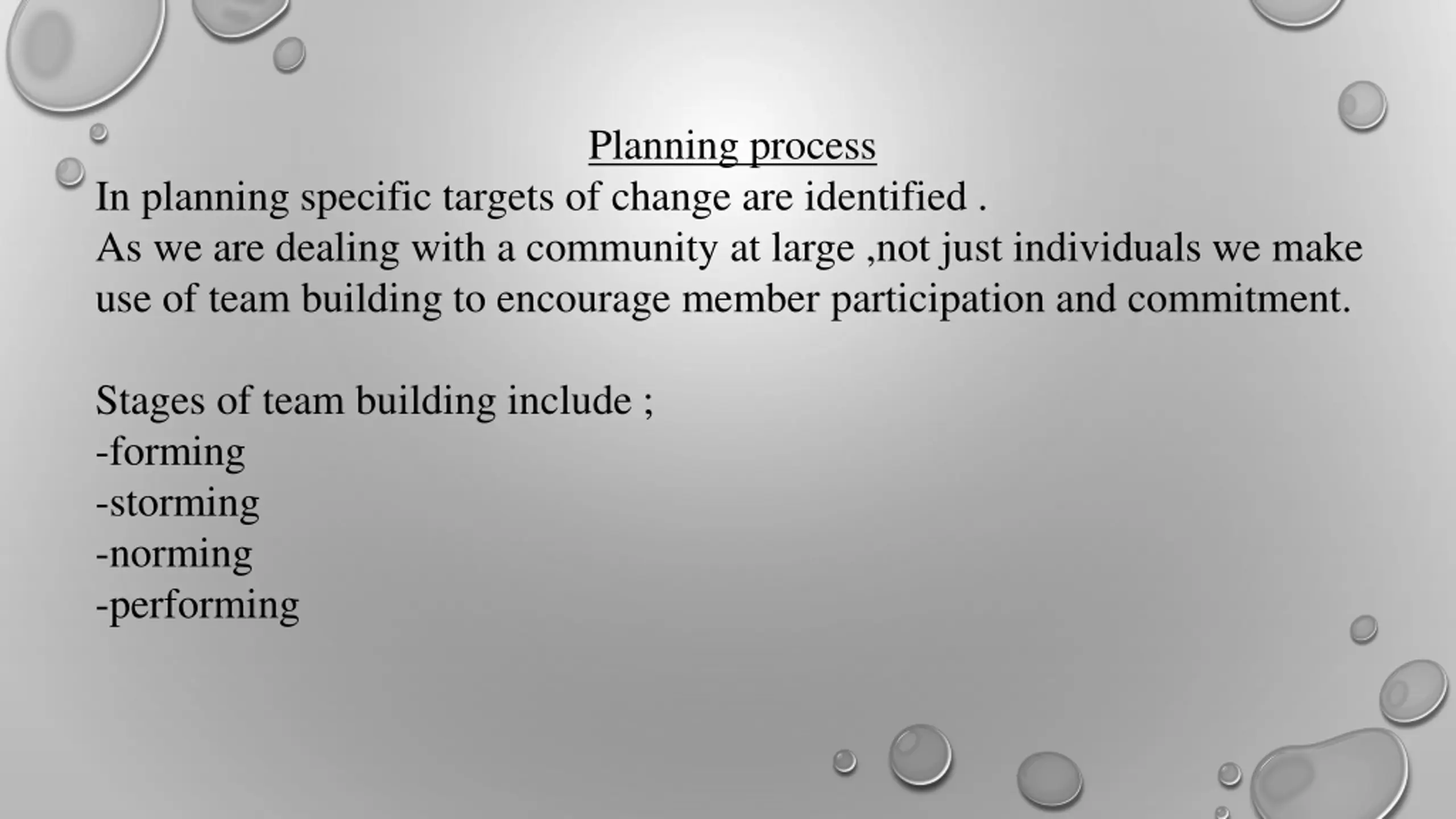 Planning process In planning specific targets of change are identified . As we are dealing with a community at large ,not just individuals we make use of team building to encourage member participation and commitment. Stages of team building include ; -forming -storming -norming -performing