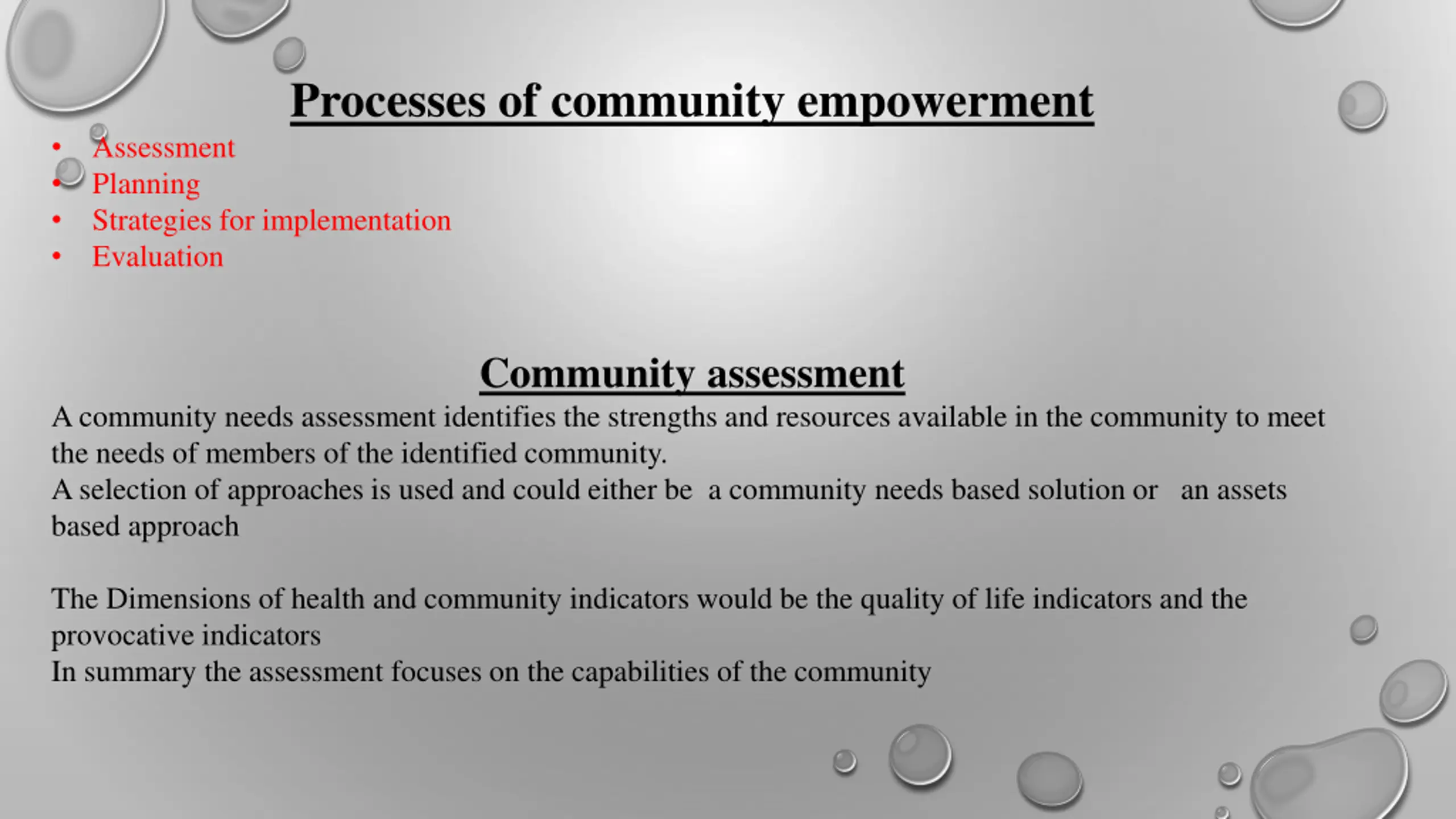 Processes of community empowerment Assessment Planning Strategies for implementation Evaluation Community assessment A community needs assessment identifies the strengths and resources available in the community to meet the needs of members of the identified community. A selection of approaches is used and could either be a community needs based solution or an assets based approach The Dimensions of health and community indicators would be the quality of life indicators and the provocative indicators In summary the assessment focuses on the capabilities of the community