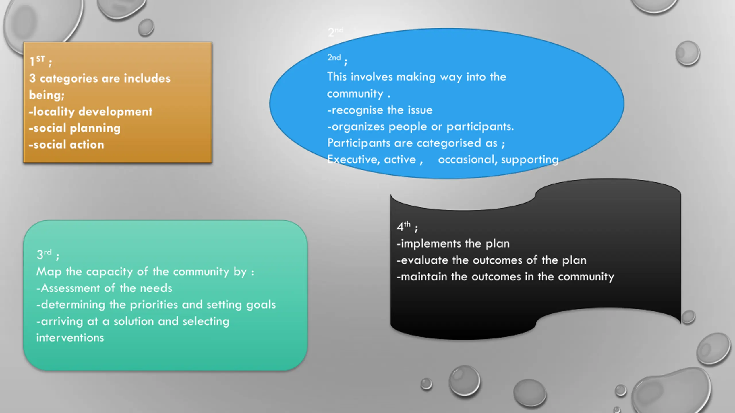 2nd 2nd ; This involves making way into the community . -recognise the issue -organizes people or participants. Participants are categorised as ; Executive, active , occasional, supporting 1ST ; 3 categories are includes being; -locality development -social planning -social action 4th ; -implements the plan -evaluate the outcomes of the plan -maintain the outcomes in the community 3rd ; Map the capacity of the community by : -Assessment of the needs -determining the priorities and setting goals -arriving at a solution and selecting interventions