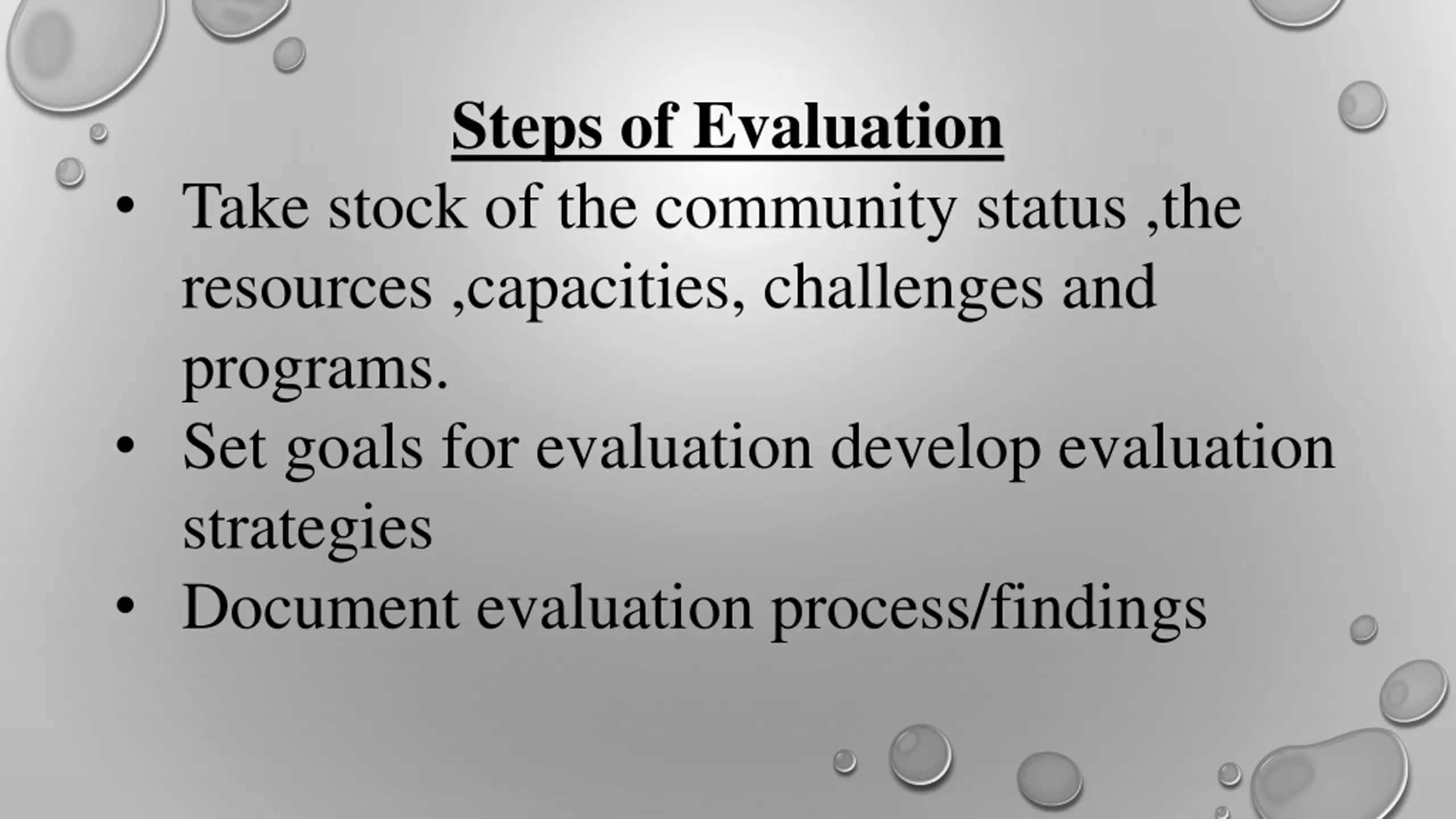 Steps of Evaluation Take stock of the community status ,the resources ,capacities, challenges and programs. Set goals for evaluation develop evaluation strategies Document evaluation process/findings
