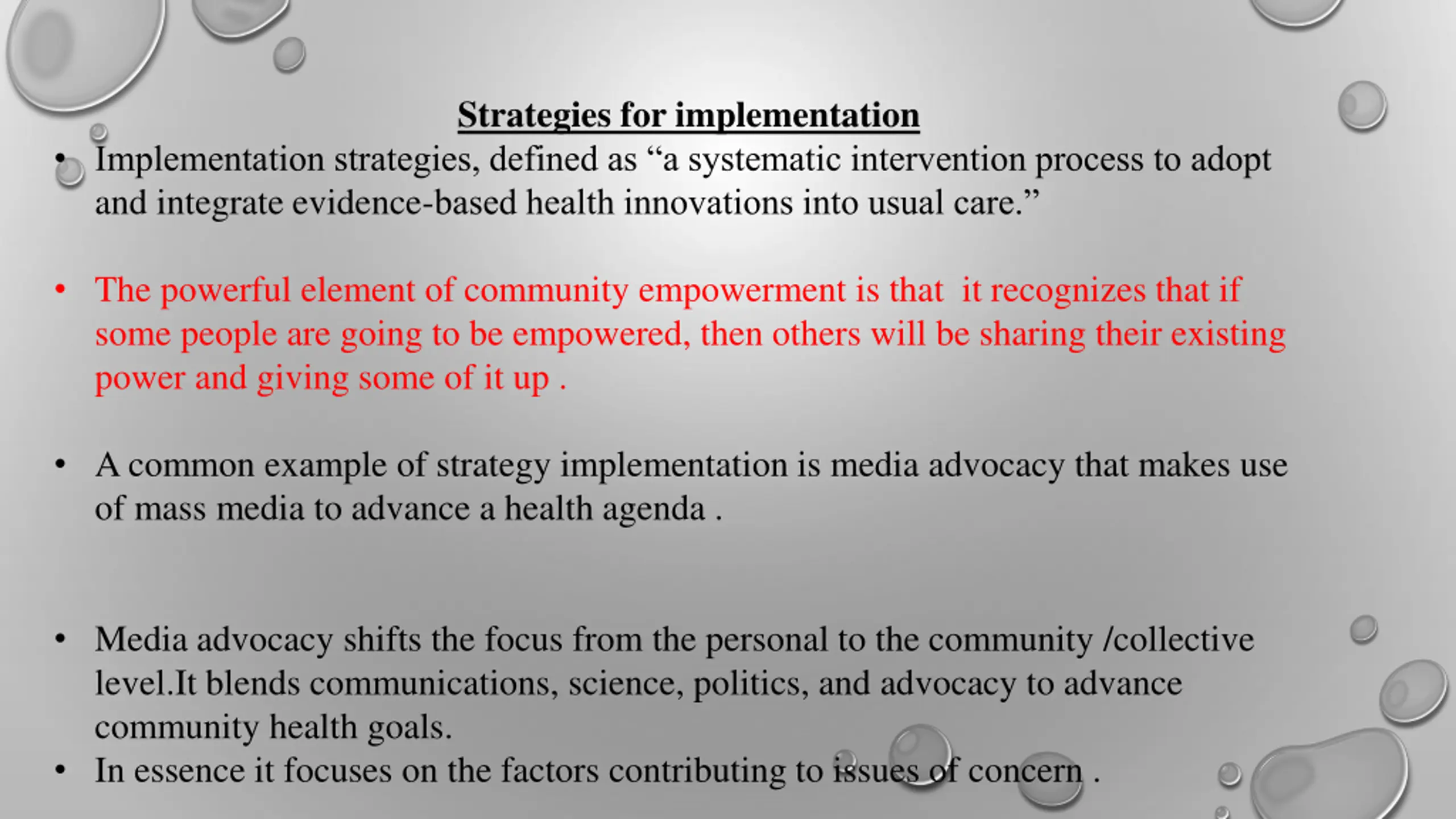 Strategies for implementation Implementation strategies, defined as a systematic intervention process to adopt and integrate evidence-based health innovations into usual care. The powerful element of community empowerment is that it recognizes that if some people are going to be empowered, then others will be sharing their existing power and giving some of it up . A common example of strategy implementation is media advocacy that makes use of mass media to advance a health agenda . Media advocacy shifts the focus from the personal to the community /collective level.It blends communications, science, politics, and advocacy to advance community health goals. In essence it focuses on the factors contributing to issues of concern .