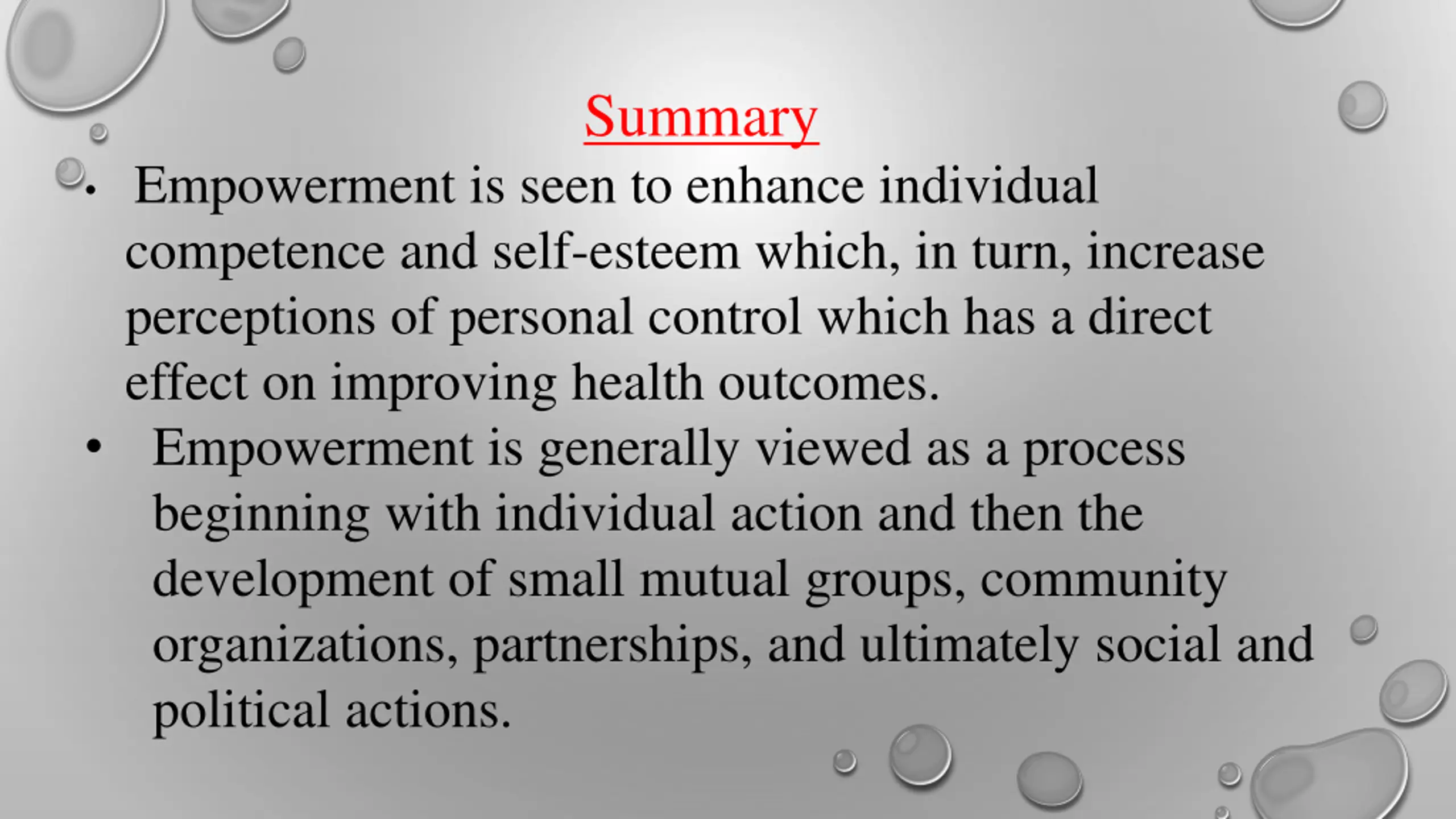 Summary Empowerment is seen to enhance individual competence and self-esteem which, in turn, increase perceptions of personal control which has a direct effect on improving health outcomes. Empowerment is generally viewed as a process beginning with individual action and then the development of small mutual groups, community organizations, partnerships, and ultimately social and political actions.