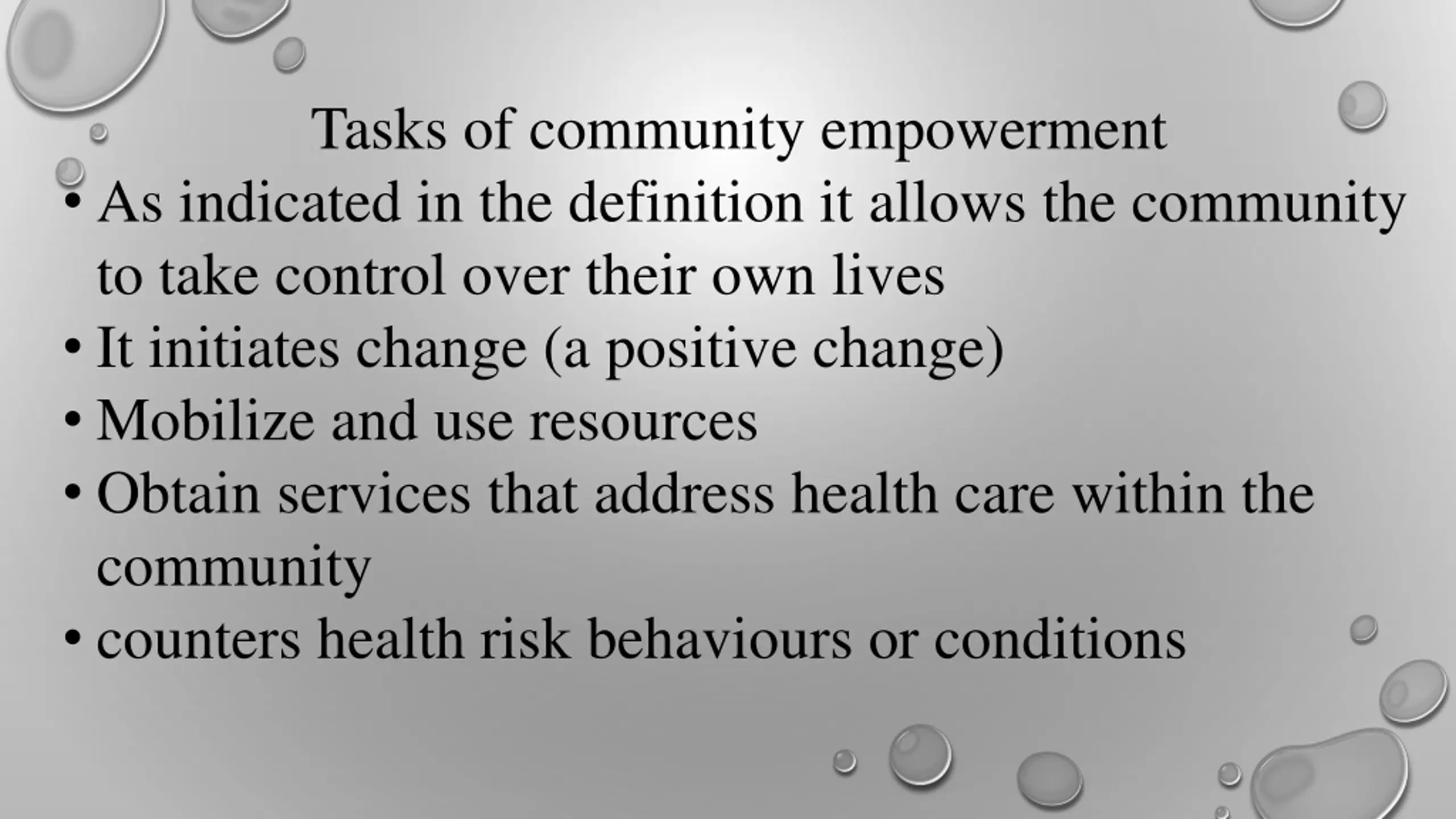 Tasks of community empowerment As indicated in the definition it allows the community to take control over their own lives It initiates change (a positive change) Mobilize and use resources Obtain services that address health care within the community counters health risk behaviours or conditions