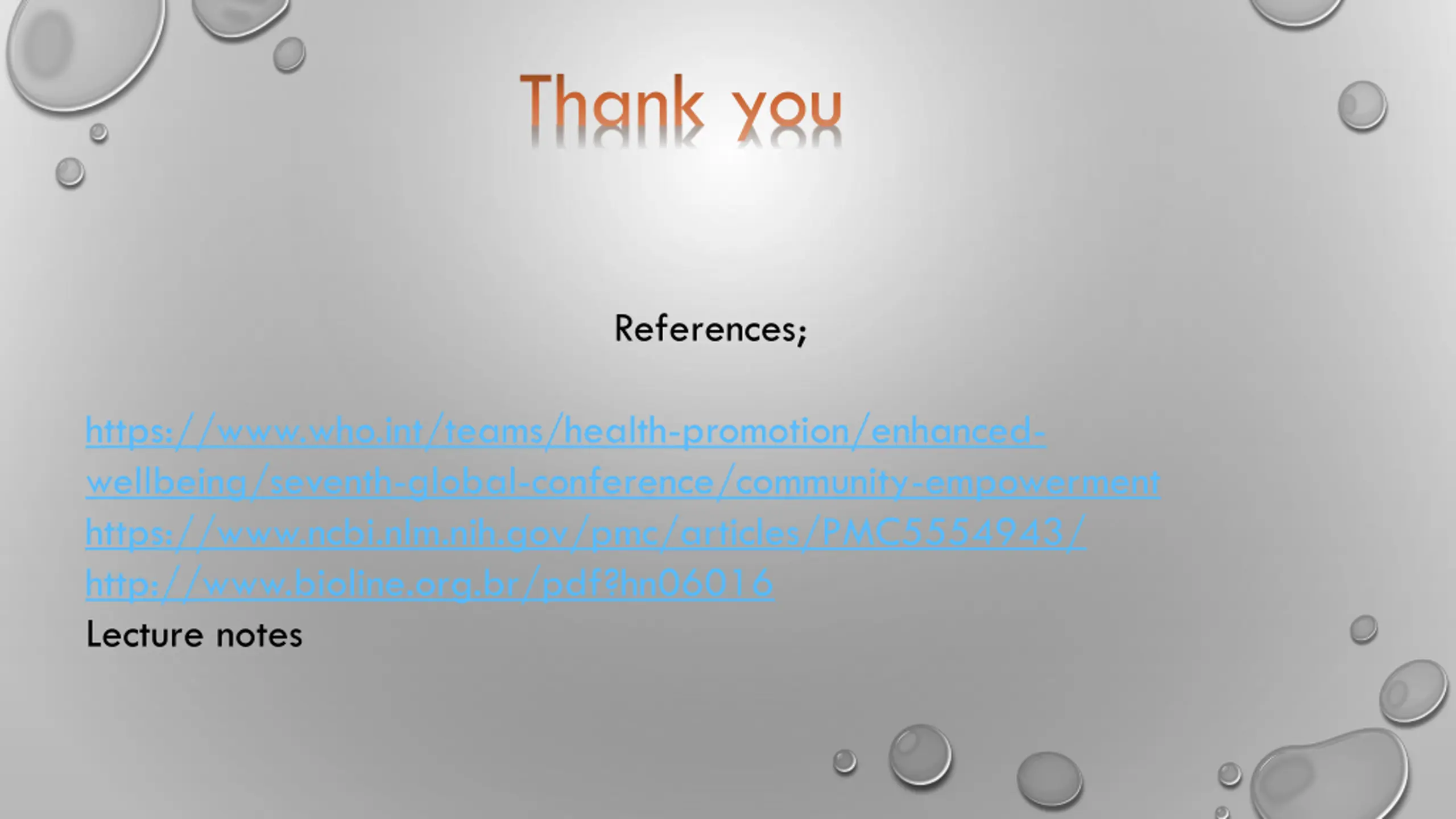 Thank you References; https://www.who.int/teams/health-promotion/enhanced- wellbeing/seventh-global-conference/community-empowerment https://www.ncbi.nlm.nih.gov/pmc/articles/PMC5554943/ http://www.bioline.org.br/pdf?hn06016 Lecture notes