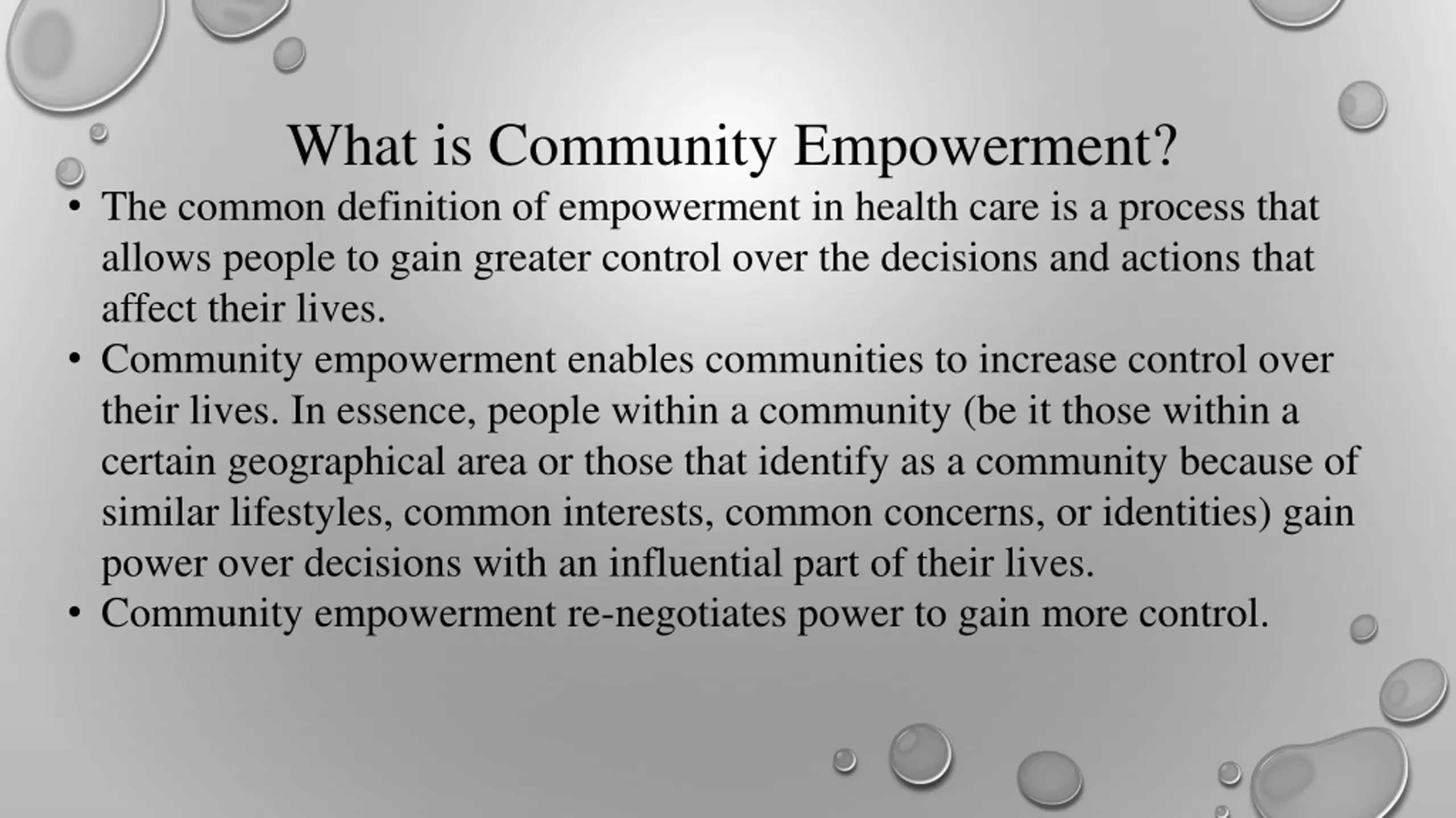 What is Community Empowerment? The common definition of empowerment in health care is a process that allows people to gain greater control over the decisions and actions that affect their lives. Community empowerment enables communities to increase control over their lives. In essence, people within a community (be it those within a certain geographical area or those that identify as a community because of similar lifestyles, common interests, common concerns, or identities) gain power over decisions with an influential part of their lives. Community empowerment re-negotiates power to gain more control.