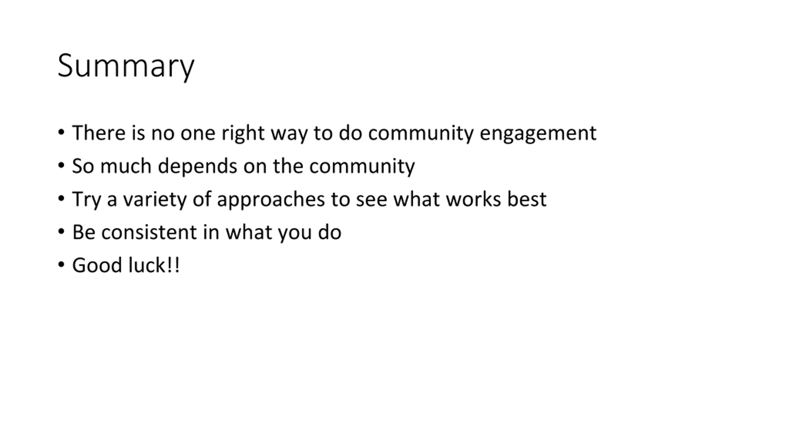 Summary There is no one right way to do community engagement So much depends on the community Try a variety of approaches to see what works best Be consistent in what you do Good luck!!