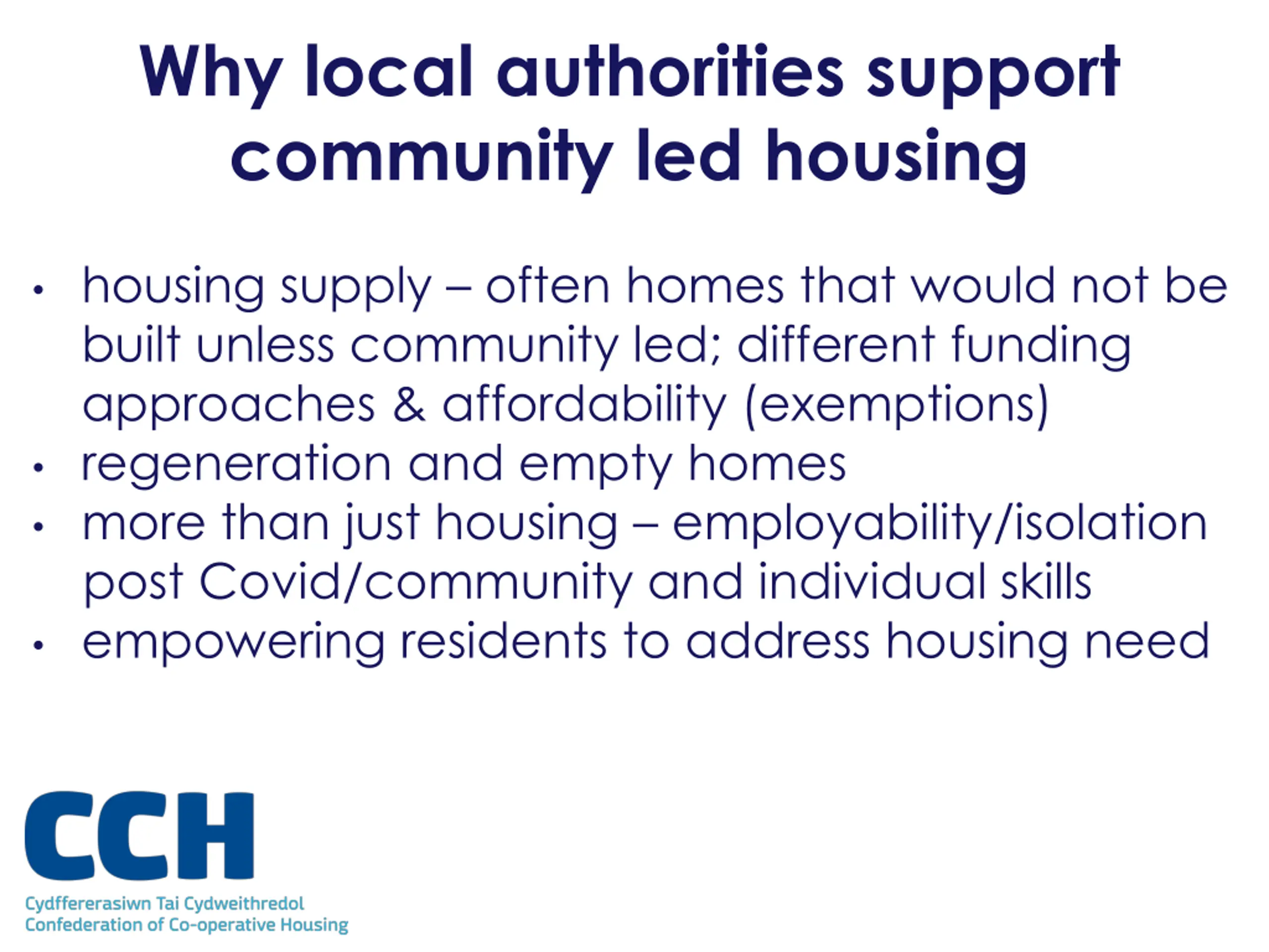 Why local authorities support community led housing housing supply often homes that would not be built unless community led; different funding approaches & affordability (exemptions) regeneration and empty homes more than just housing employability/isolation post Covid/community and individual skills empowering residents to address housing need