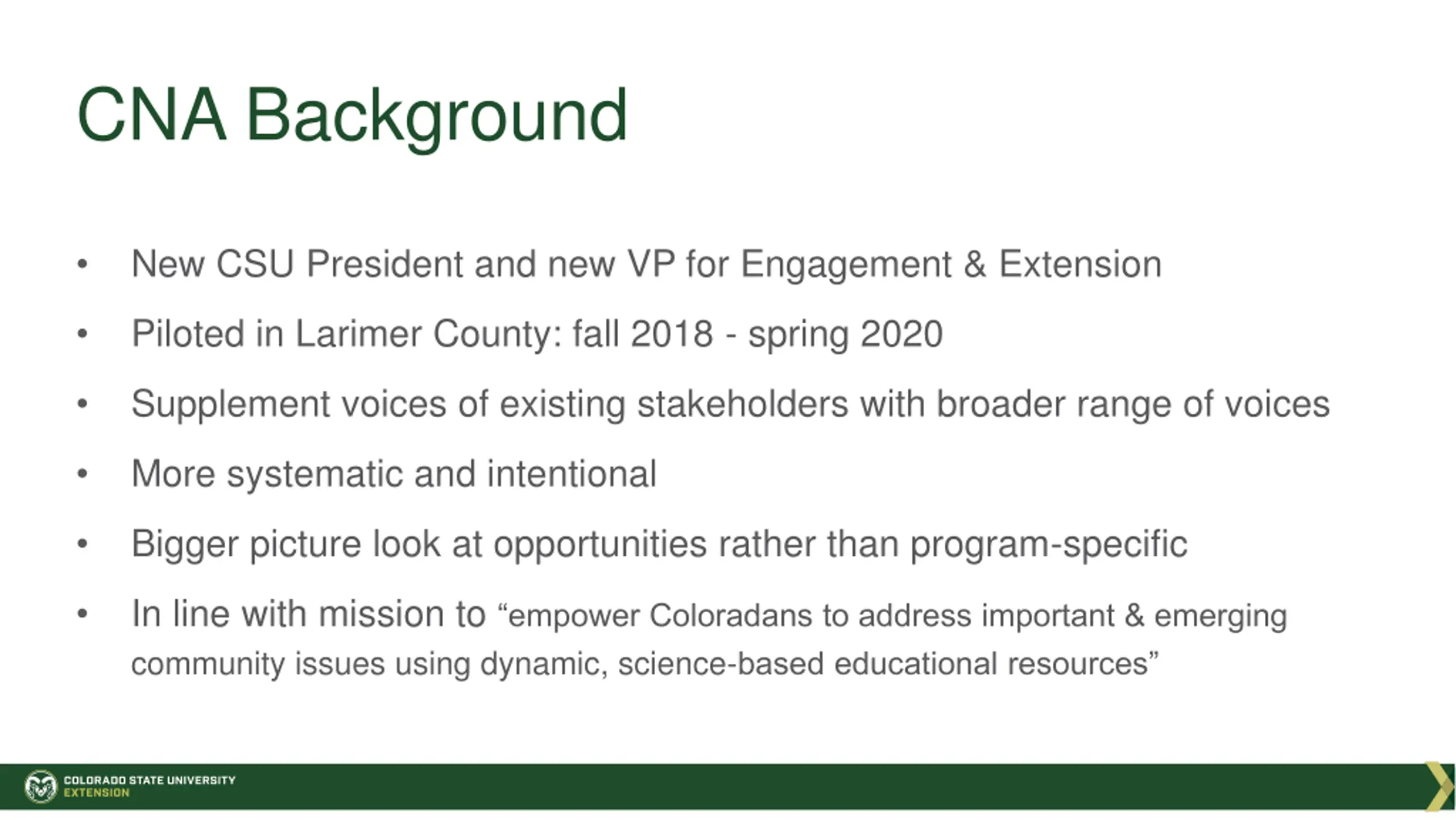 CNA Background New CSU President and new VP for Engagement & Extension Piloted in Larimer County: fall 2018 - spring 2020 Supplement voices of existing stakeholders with broader range of voices More systematic and intentional Bigger picture look at opportunities rather than program-specific In line with mission to empower Coloradans to address important & emerging community issues using dynamic, science-based educational resources