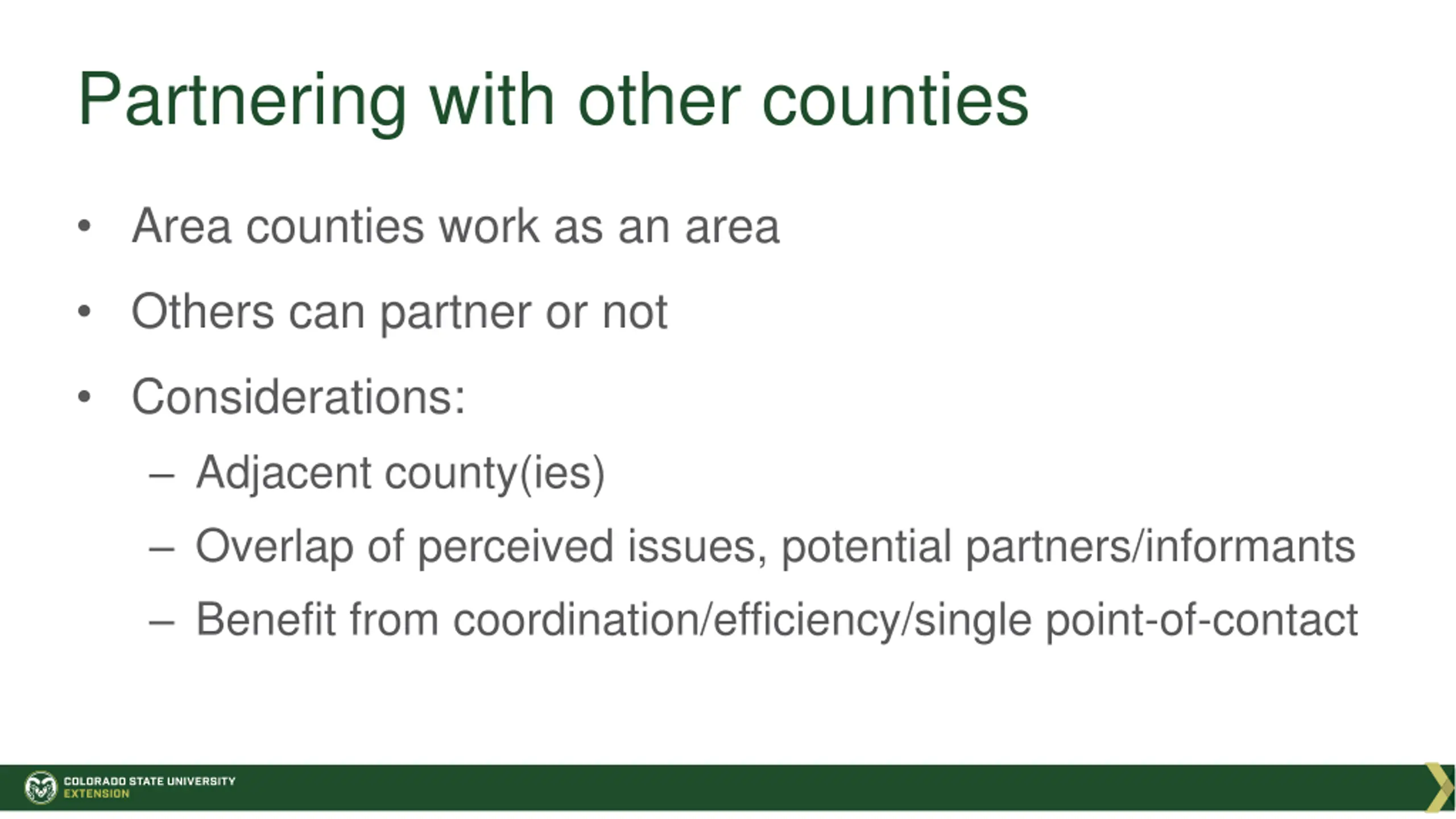 Partnering with other counties Area counties work as an area Others can partner or not Considerations: Adjacent county(ies) Overlap of perceived issues, potential partners/informants Benefit from coordination/efficiency/single point-of-contact