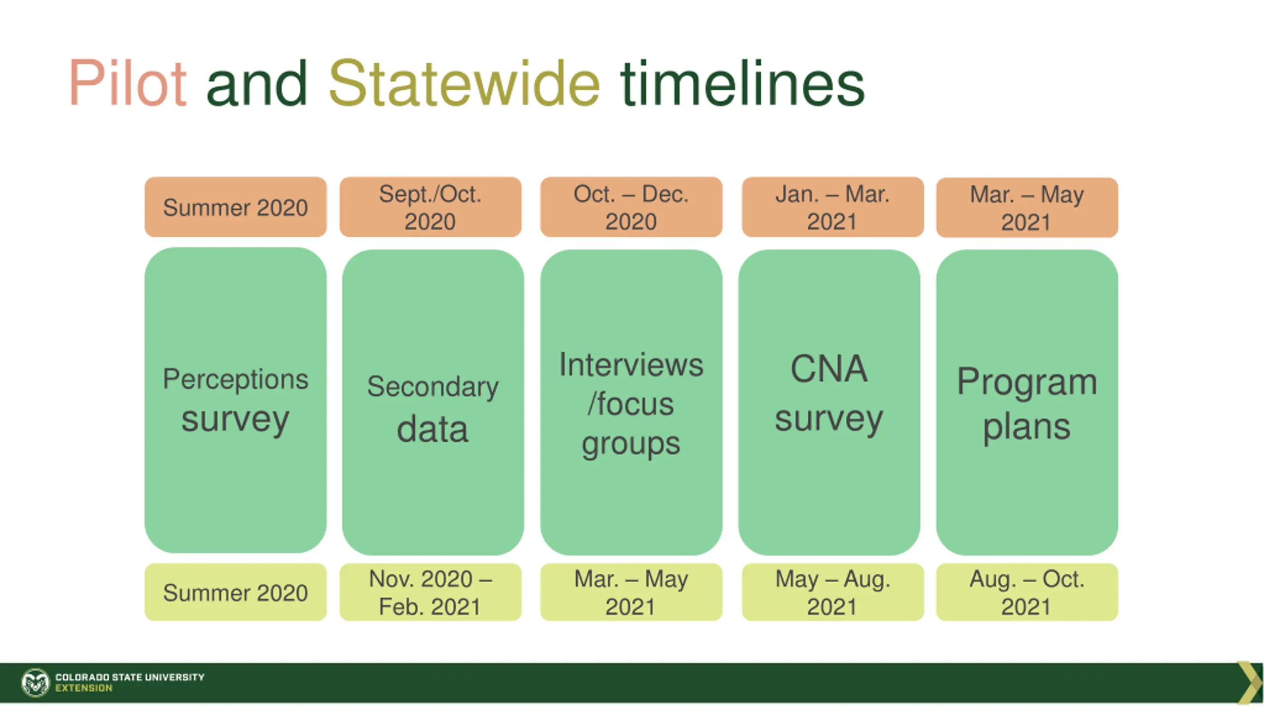 Pilot and Statewide timelines Sept./Oct. 2020 Oct. Dec. 2020 Jan. Mar. 2021 Mar. May 2021 Summer 2020 CNA survey Interviews /focus groups Secondary data Program plans Perceptions survey Nov. 2020 Feb. 2021 Mar. May 2021 May Aug. 2021 Aug. Oct. 2021 Summer 2020