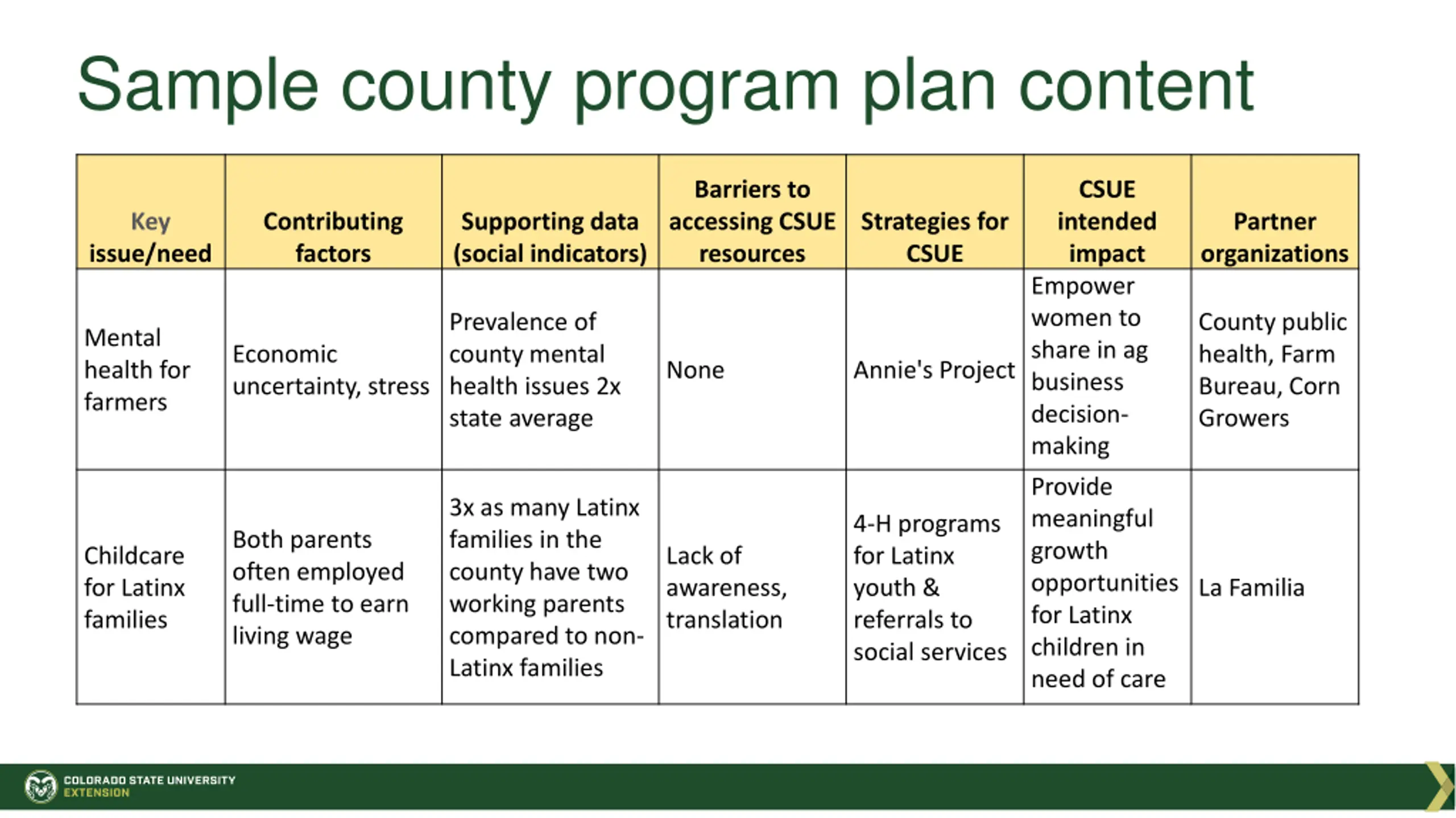Sample county program plan content Barriers to accessing CSUE resources CSUE intended impact Empower women to share in ag business decision- making Key Contributing factors Supporting data (social indicators) Strategies for CSUE Partner organizations issue/need Prevalence of county mental health issues 2x state average County public health, Farm Bureau, Corn Growers Mental health for farmers Economic uncertainty, stress None Annie's Project Provide meaningful growth opportunities for Latinx children in need of care 3x as many Latinx families in the county have two working parents compared to non- Latinx families 4-H programs for Latinx youth & referrals to social services Both parents often employed full-time to earn living wage Childcare for Latinx families Lack of awareness, translation La Familia