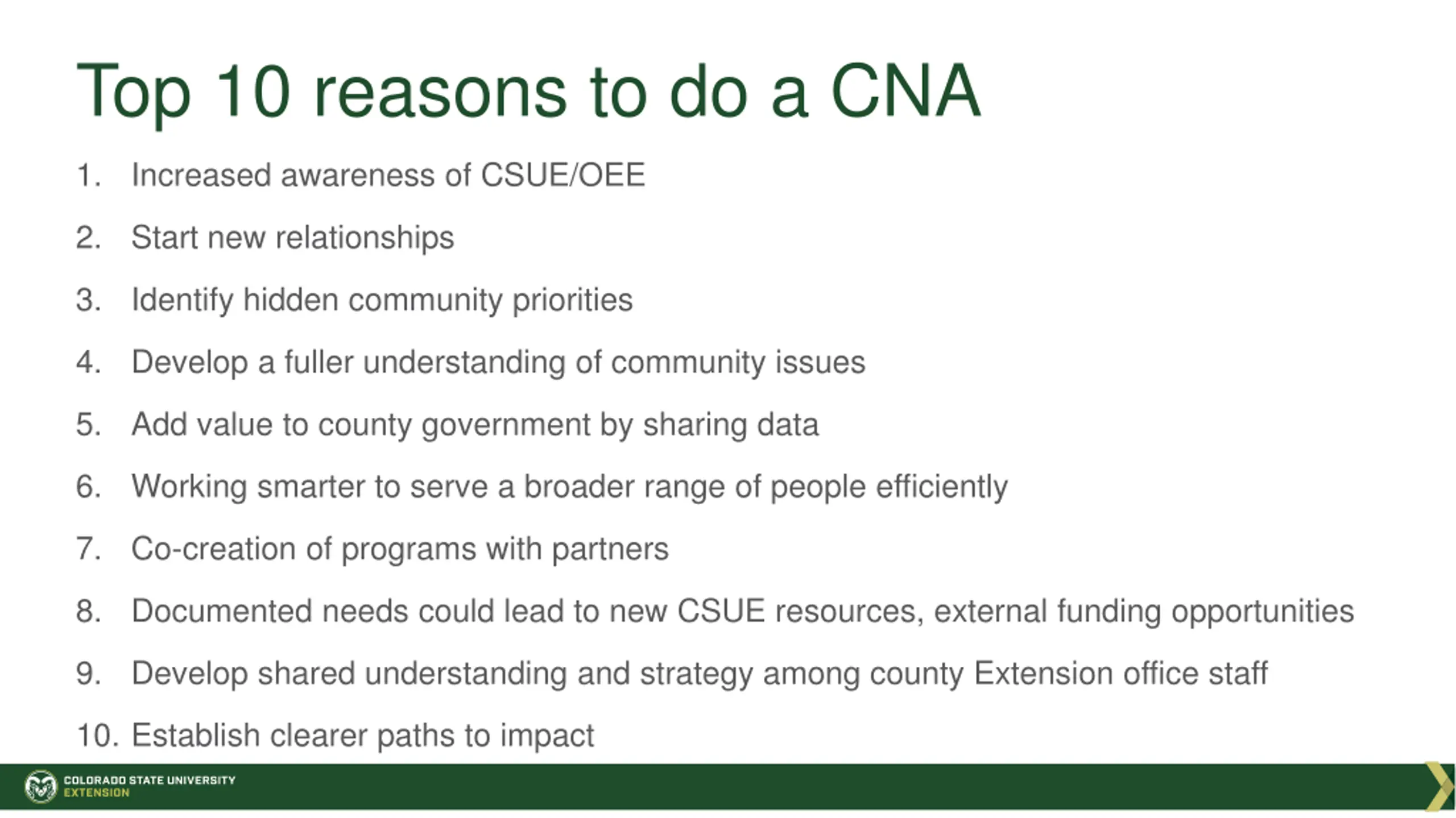 Top 10 reasons to do a CNA 1. Increased awareness of CSUE/OEE 2. Start new relationships 3. Identify hidden community priorities 4. Develop a fuller understanding of community issues 5. Add value to county government by sharing data 6. Working smarter to serve a broader range of people efficiently 7. Co-creation of programs with partners 8. Documented needs could lead to new CSUE resources, external funding opportunities 9. Develop shared understanding and strategy among county Extension office staff 10. Establish clearer paths to impact