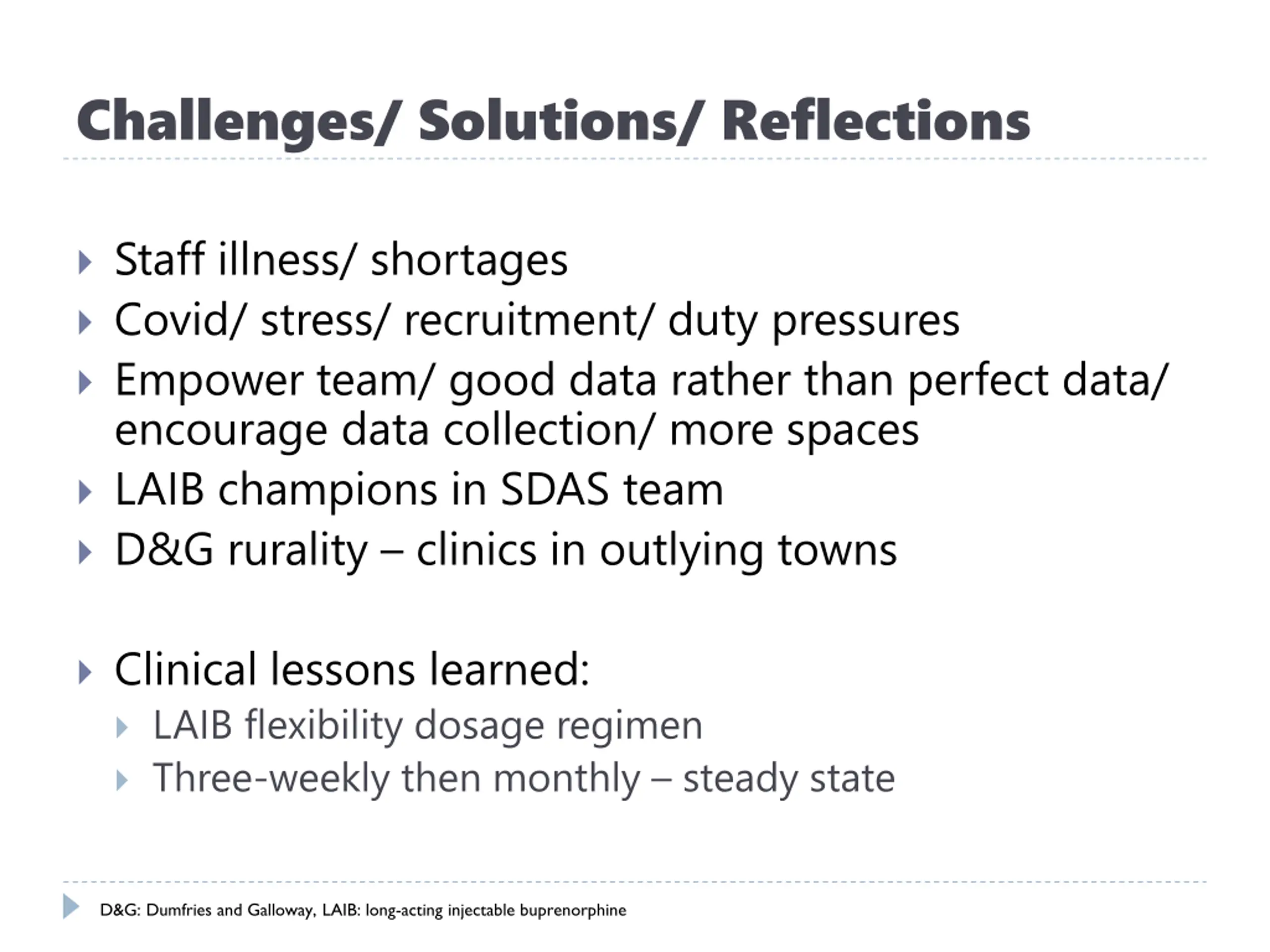 Challenges/ Solutions/ Reflections Staff illness/ shortages Covid/ stress/ recruitment/ duty pressures Empower team/ good data rather than perfect data/ encourage data collection/ more spaces LAIB champions in SDAS team D&G rurality clinics in outlying towns Clinical lessons learned: LAIB flexibility dosage regimen Three-weekly then monthly steady state D&G: Dumfries and Galloway, LAIB: long-acting injectable buprenorphine