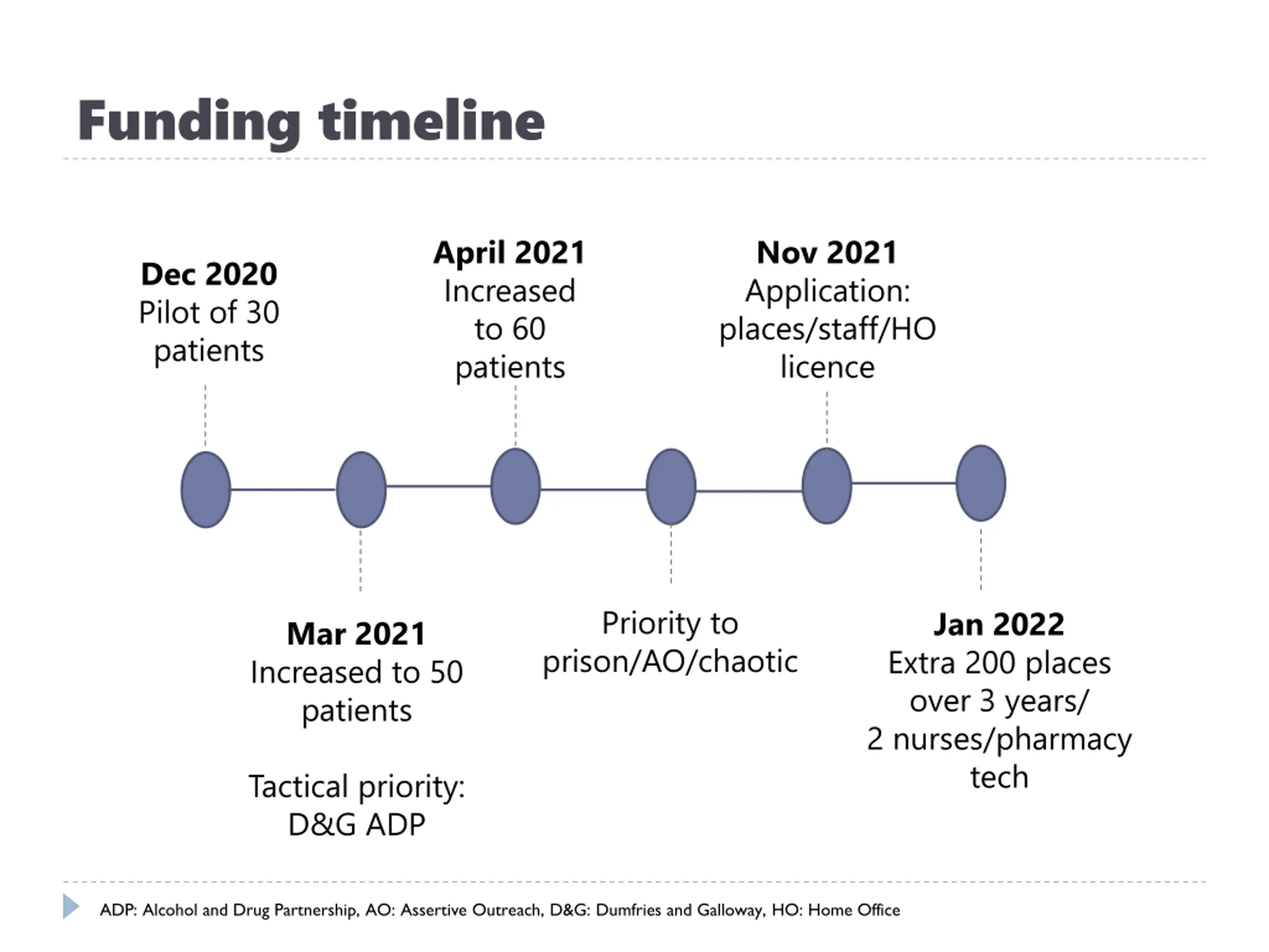 Funding timeline April 2021 Increased to 60 patients Nov 2021 Application: places/staff/HO licence Dec 2020 Pilot of 30 patients Priority to prison/AO/chaotic Jan 2022 Extra 200 places over 3 years/ 2 nurses/pharmacy tech Mar 2021 Increased to 50 patients Tactical priority: D&G ADP ADP: Alcohol and Drug Partnership, AO: Assertive Outreach, D&G: Dumfries and Galloway, HO: Home Office