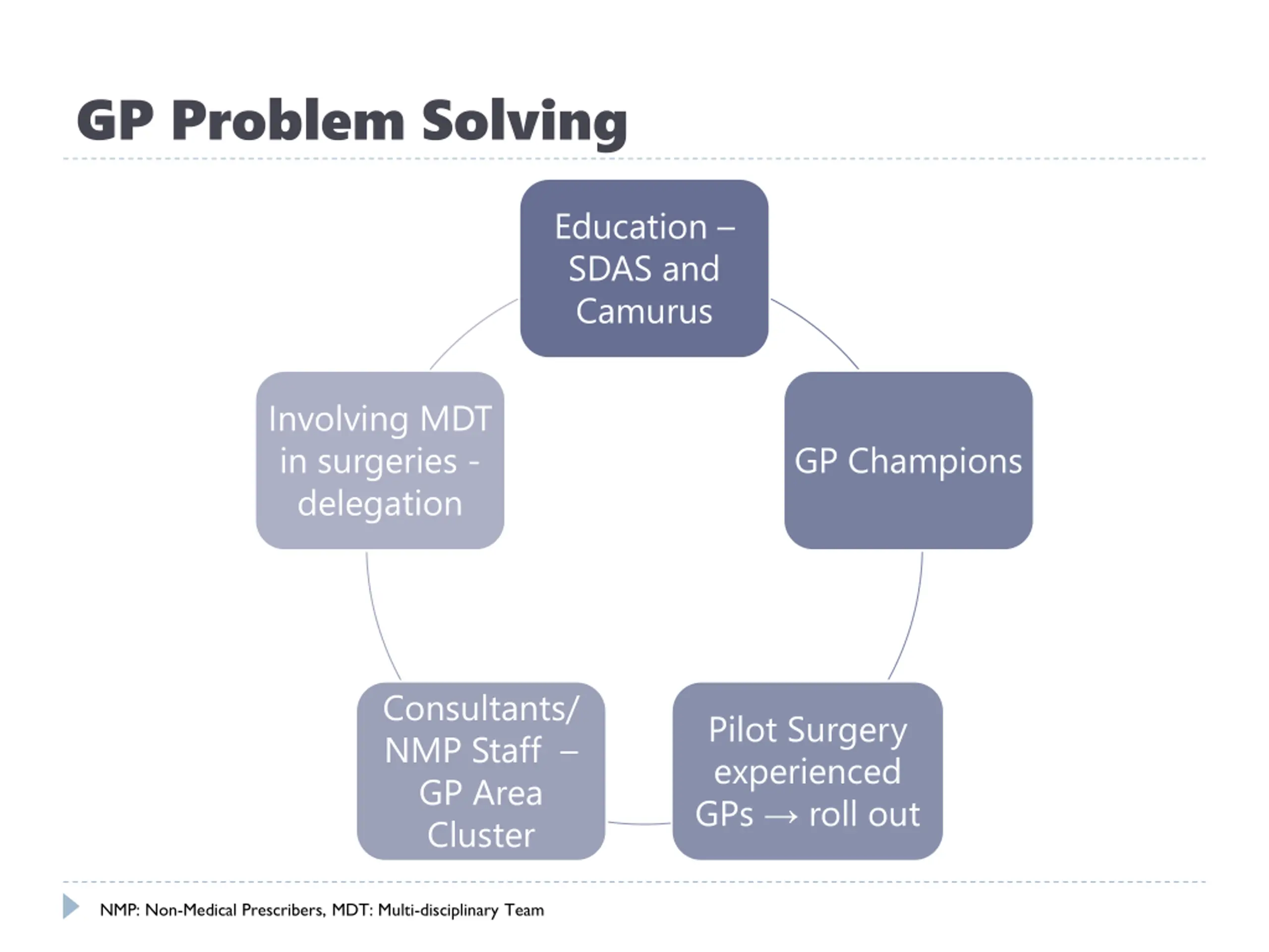 GP Problem Solving Education SDAS and Camurus Involving MDT in surgeries - delegation GP Champions Consultants/ NMP Staff GP Area Cluster Pilot Surgery experienced GPs roll out NMP: Non-Medical Prescribers, MDT: Multi-disciplinary Team