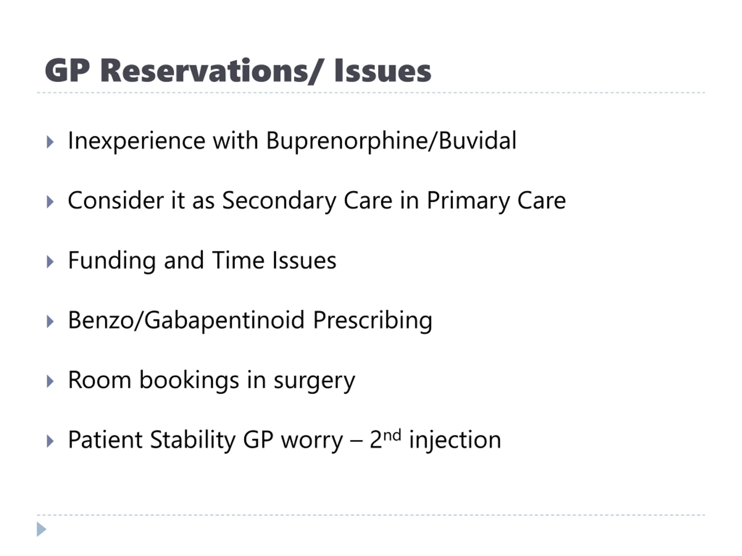 GP Reservations/ Issues Inexperience with Buprenorphine/Buvidal Consider it as Secondary Care in Primary Care Funding and Time Issues Benzo/Gabapentinoid Prescribing Room bookings in surgery Patient Stability GP worry 2nd injection
