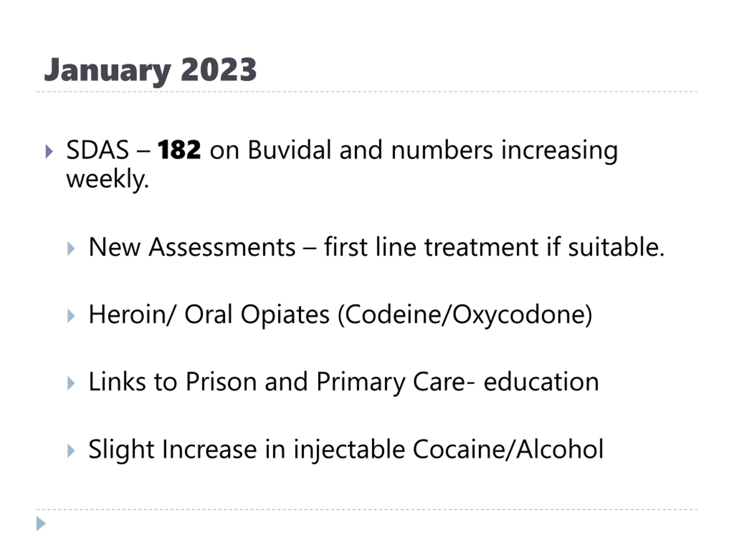 January 2023 SDAS 182 on Buvidal and numbers increasing weekly. New Assessments first line treatment if suitable. Heroin/ Oral Opiates (Codeine/Oxycodone) Links to Prison and Primary Care- education Slight Increase in injectable Cocaine/Alcohol