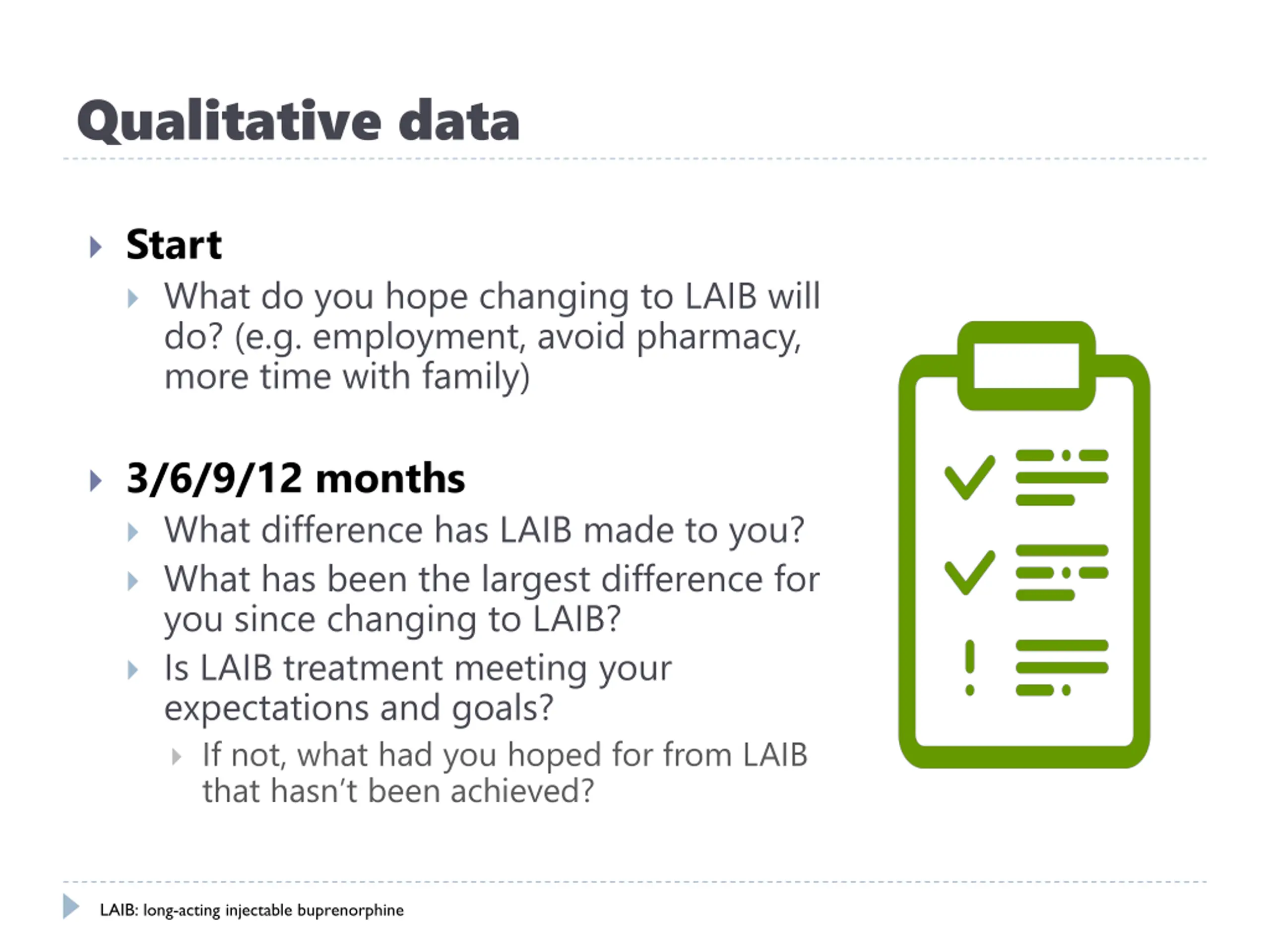 Qualitative data Start What do you hope changing to LAIB will do? (e.g. employment, avoid pharmacy, more time with family) 3/6/9/12 months What difference has LAIB made to you? What has been the largest difference for you since changing to LAIB? Is LAIB treatment meeting your expectations and goals? If not, what had you hoped for from LAIB that hasn t been achieved? LAIB: long-acting injectable buprenorphine
