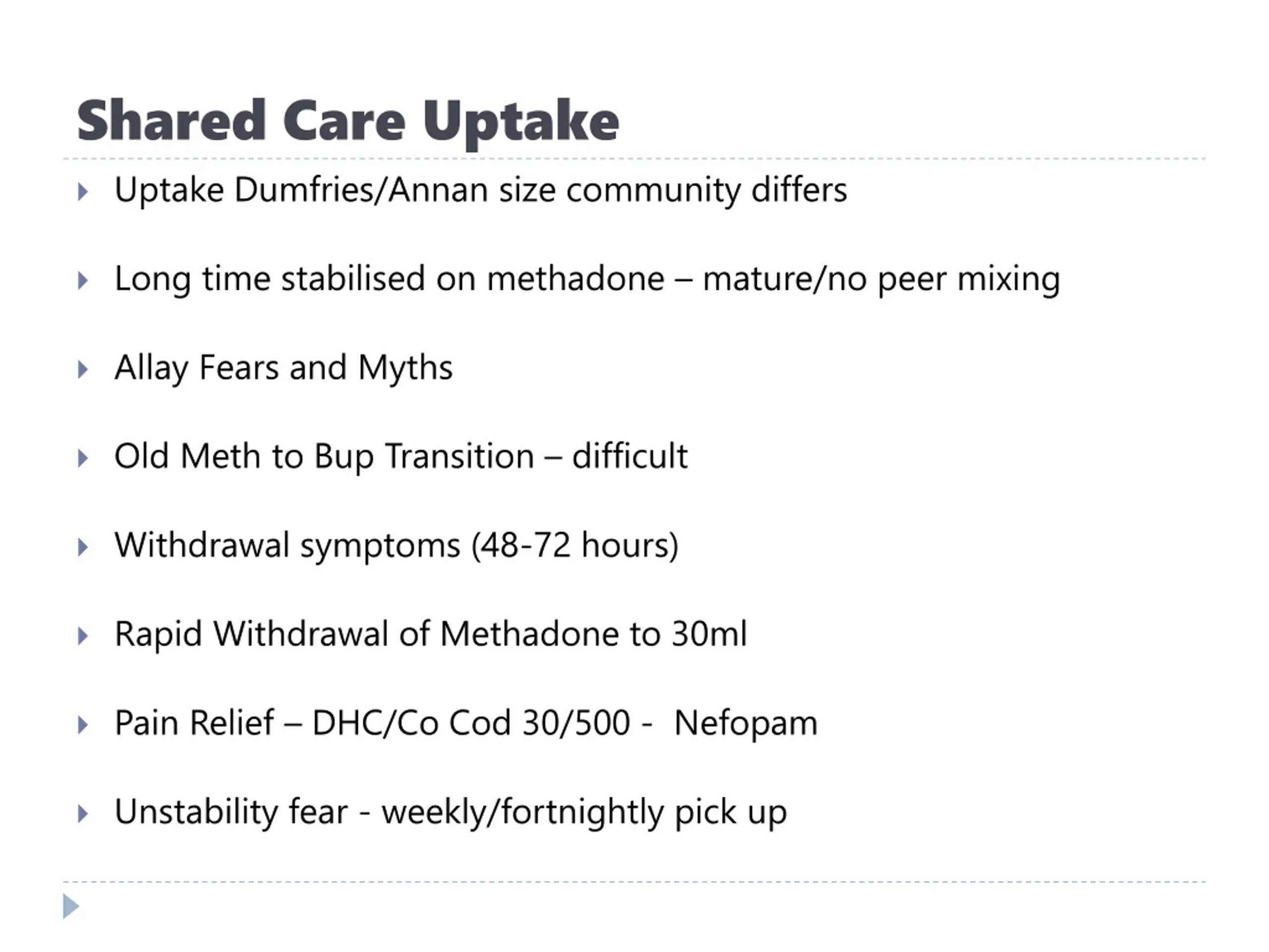 Shared Care Uptake Uptake Dumfries/Annan size community differs Long time stabilised on methadone mature/no peer mixing Allay Fears and Myths Old Meth to Bup Transition difficult Withdrawal symptoms (48-72 hours) Rapid Withdrawal of Methadone to 30ml Pain Relief DHC/Co Cod 30/500 - Nefopam Unstability fear - weekly/fortnightly pick up