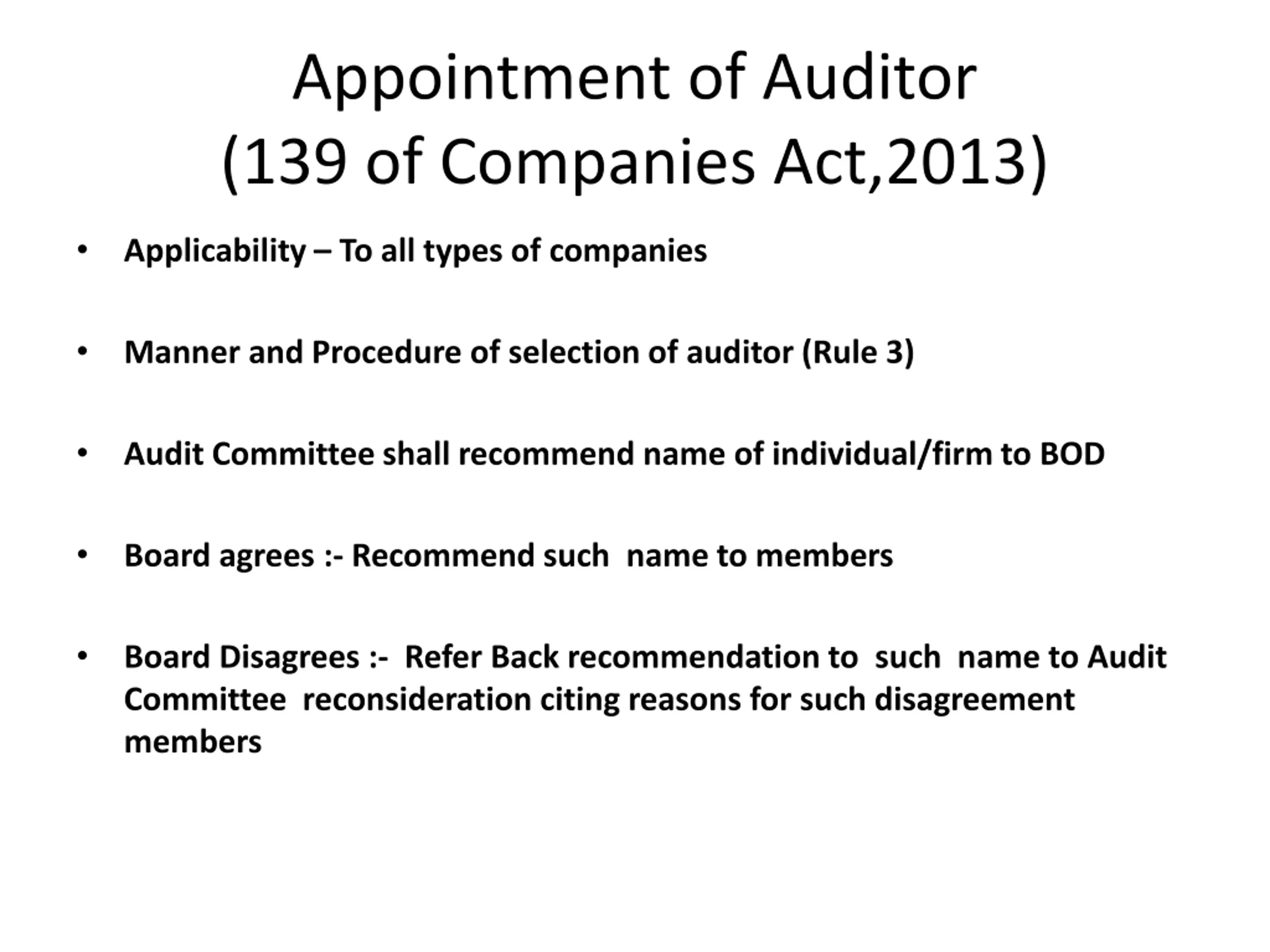 Appointment of Auditor (139 of Companies Act,2013) Applicability To all types of companies Manner and Procedure of selection of auditor (Rule 3) Audit Committee shall recommend name of individual/firm to BOD Board agrees :- Recommend such name to members Board Disagrees :- Refer Back recommendation to such name to Audit Committee reconsideration citing reasons for such disagreement members