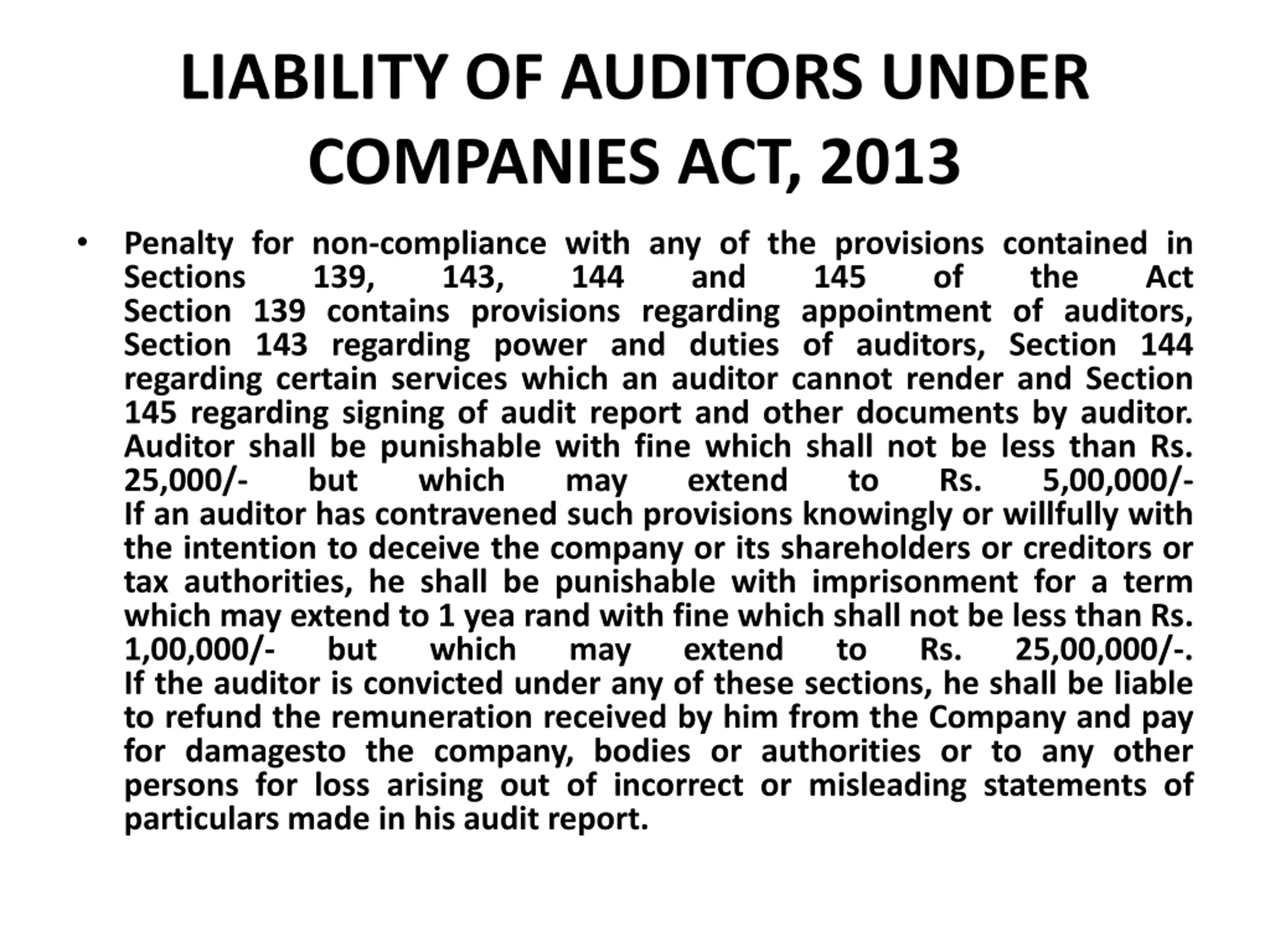 LIABILITY OF AUDITORS UNDER COMPANIES ACT, 2013 Penalty for non-compliance with any of the provisions contained in Sections 139, 143, 144 Section 139 contains provisions regarding appointment of auditors, Section 143 regarding power and duties of auditors, Section 144 regarding certain services which an auditor cannot render and Section 145 regarding signing of audit report and other documents by auditor. Auditor shall be punishable with fine which shall not be less than Rs. 25,000/- but which may If an auditor has contravened such provisions knowingly or willfully with the intention to deceive the company or its shareholders or creditors or tax authorities, he shall be punishable with imprisonment for a term which may extend to 1 yea rand with fine which shall not be less than Rs. 1,00,000/- but which may If the auditor is convicted under any of these sections, he shall be liable to refund the remuneration received by him from the Company and pay for damagesto the company, bodies or authorities or to any other persons for loss arising out of incorrect or misleading statements of particulars made in his audit report. and 145 of the Act extend to Rs. 5,00,000/- extend to Rs. 25,00,000/-.