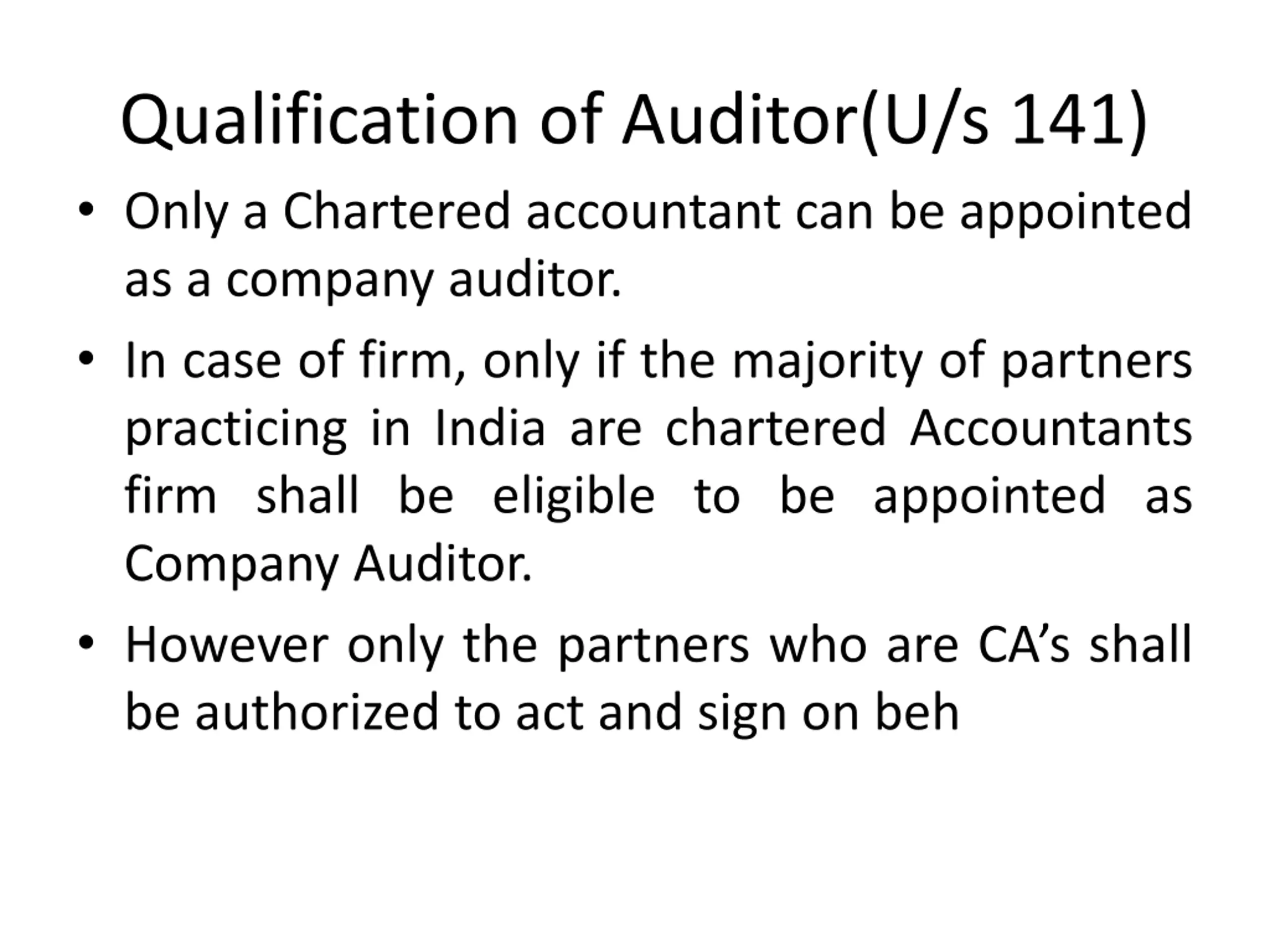 Qualification of Auditor(U/s 141) Only a Chartered accountant can be appointed as a company auditor. In case of firm, only if the majority of partners practicing in India are chartered Accountants firm shall be eligible to be appointed as Company Auditor. However only the partners who are CA s shall be authorized to act and sign on beh