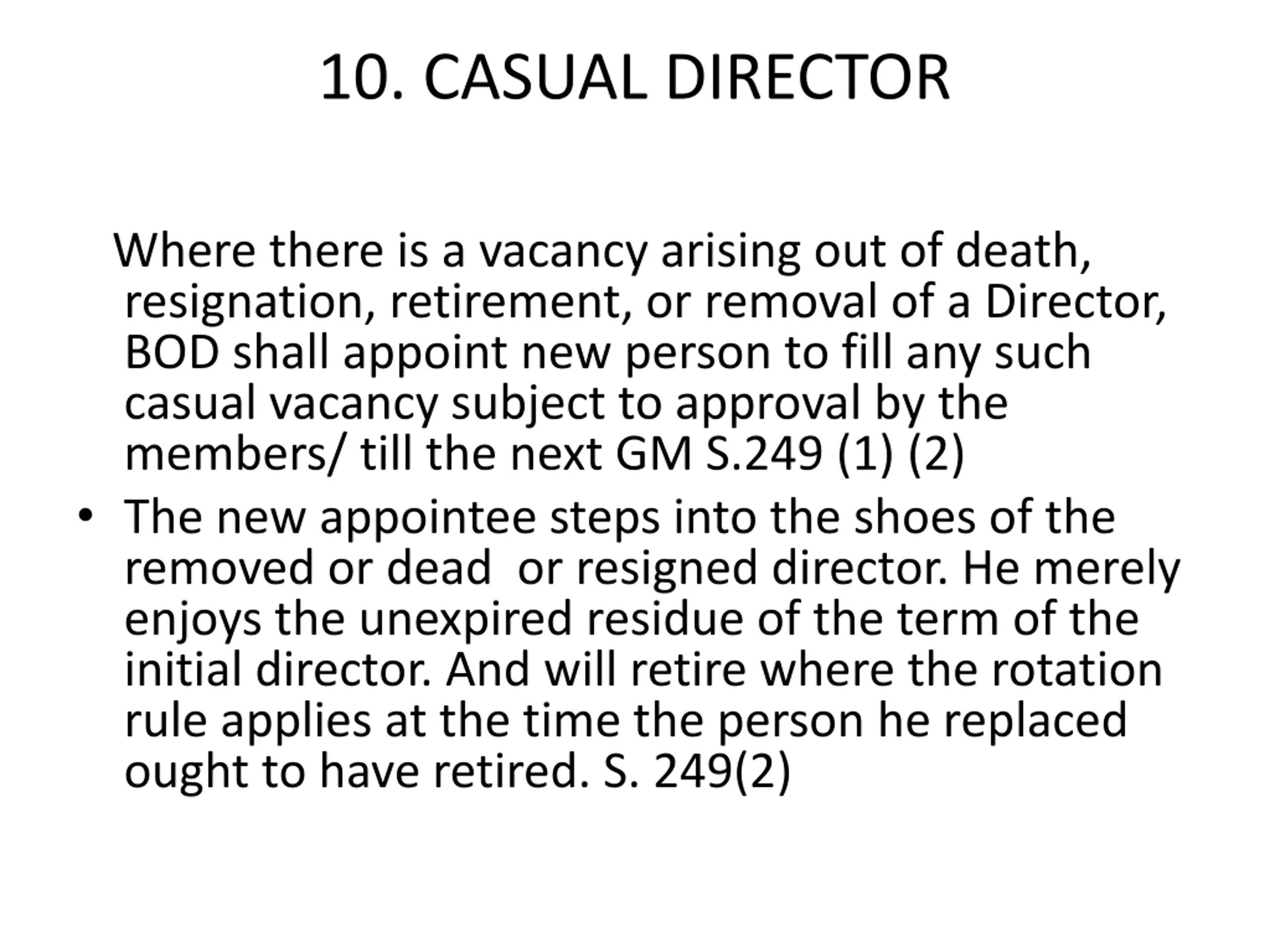 10. CASUAL DIRECTOR Where there is a vacancy arising out of death, resignation, retirement, or removal of a Director, BOD shall appoint new person to fill any such casual vacancy subject to approval by the members/ till the next GM S.249 (1) (2) The new appointee steps into the shoes of the removed or dead or resigned director. He merely enjoys the unexpired residue of the term of the initial director. And will retire where the rotation rule applies at the time the person he replaced ought to have retired. S. 249(2)