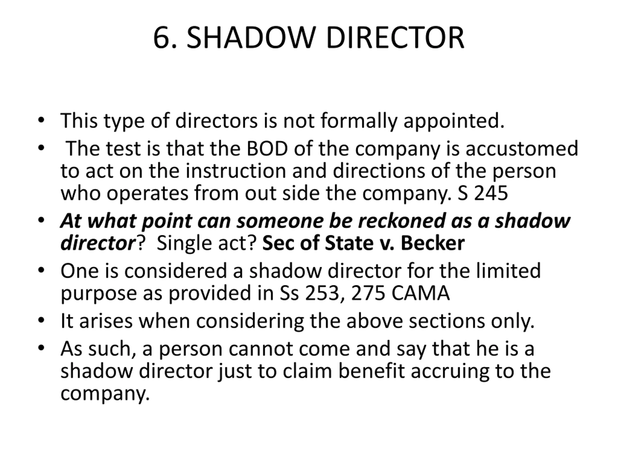 6. SHADOW DIRECTOR This type of directors is not formally appointed. The test is that the BOD of the company is accustomed to act on the instruction and directions of the person who operates from out side the company. S 245 At what point can someone be reckoned as a shadow director? Single act? Sec of State v. Becker One is considered a shadow director for the limited purpose as provided in Ss 253, 275 CAMA It arises when considering the above sections only. As such, a person cannot come and say that he is a shadow director just to claim benefit accruing to the company.