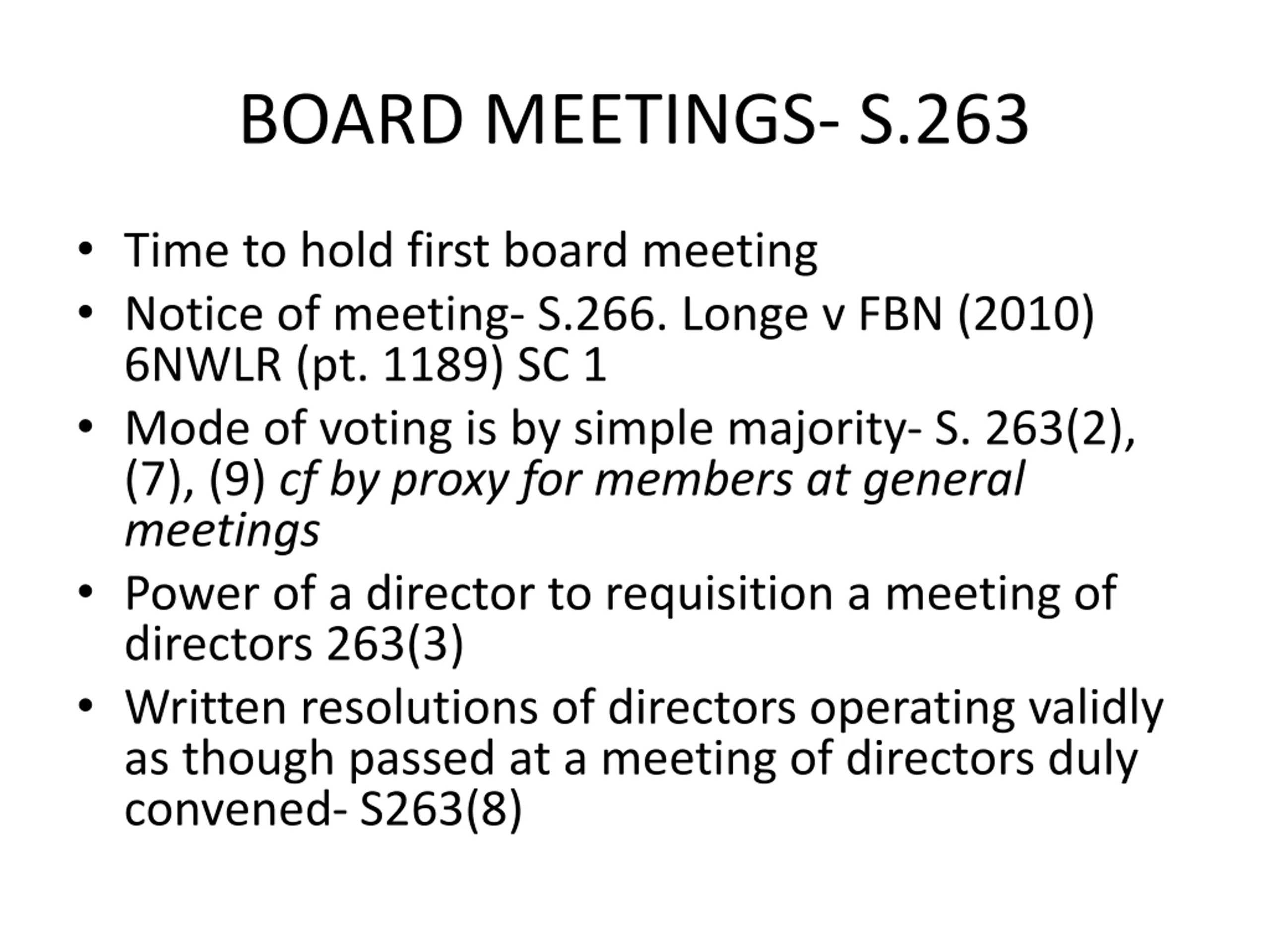 BOARD MEETINGS- S.263 Time to hold first board meeting Notice of meeting- S.266. Longe v FBN (2010) 6NWLR (pt. 1189) SC 1 Mode of voting is by simple majority- S. 263(2), (7), (9) cf by proxy for members at general meetings Power of a director to requisition a meeting of directors 263(3) Written resolutions of directors operating validly as though passed at a meeting of directors duly convened- S263(8)