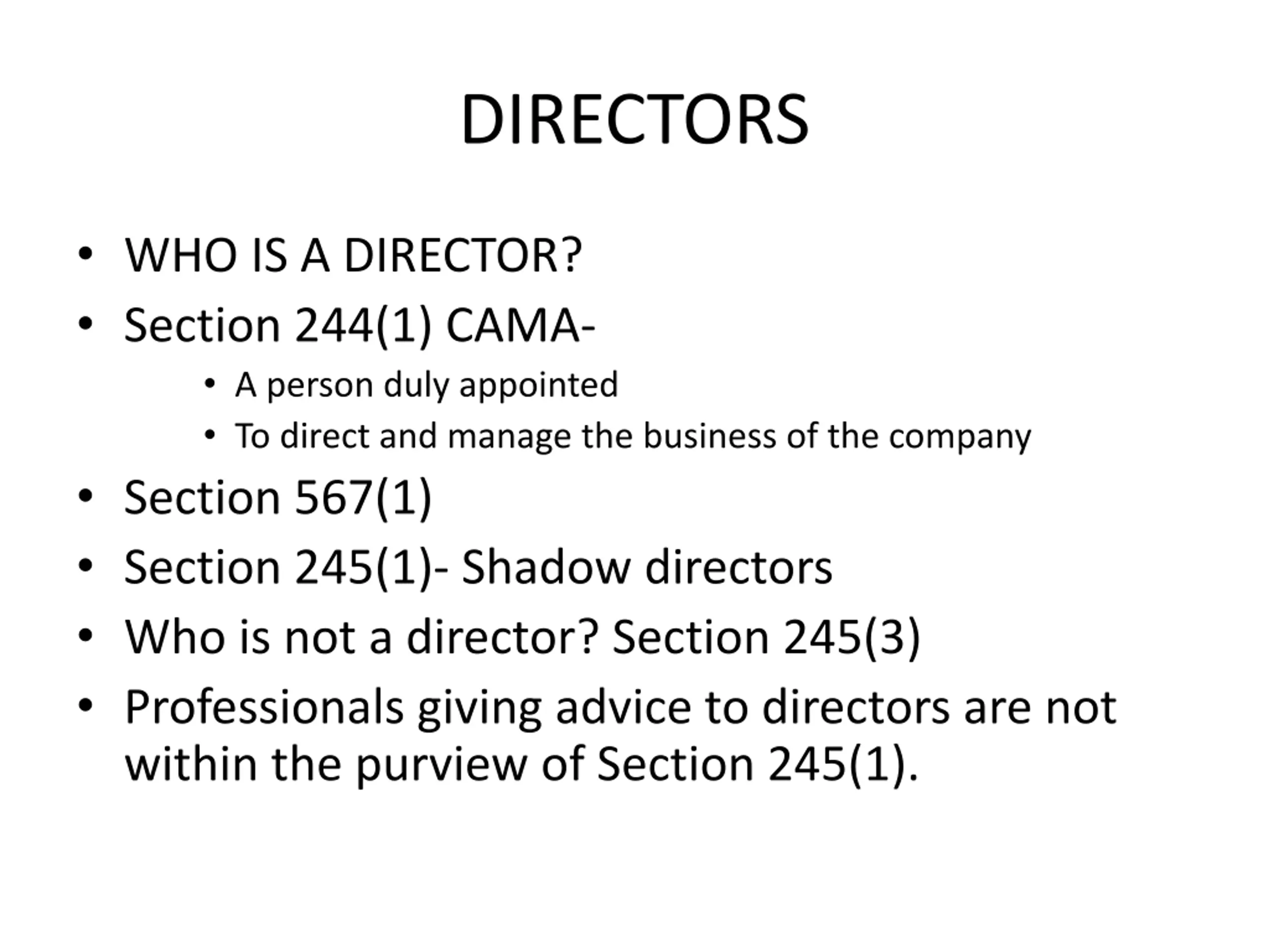 DIRECTORS WHO IS A DIRECTOR? Section 244(1) CAMA- A person duly appointed To direct and manage the business of the company Section 567(1) Section 245(1)- Shadow directors Who is not a director? Section 245(3) Professionals giving advice to directors are not within the purview of Section 245(1).