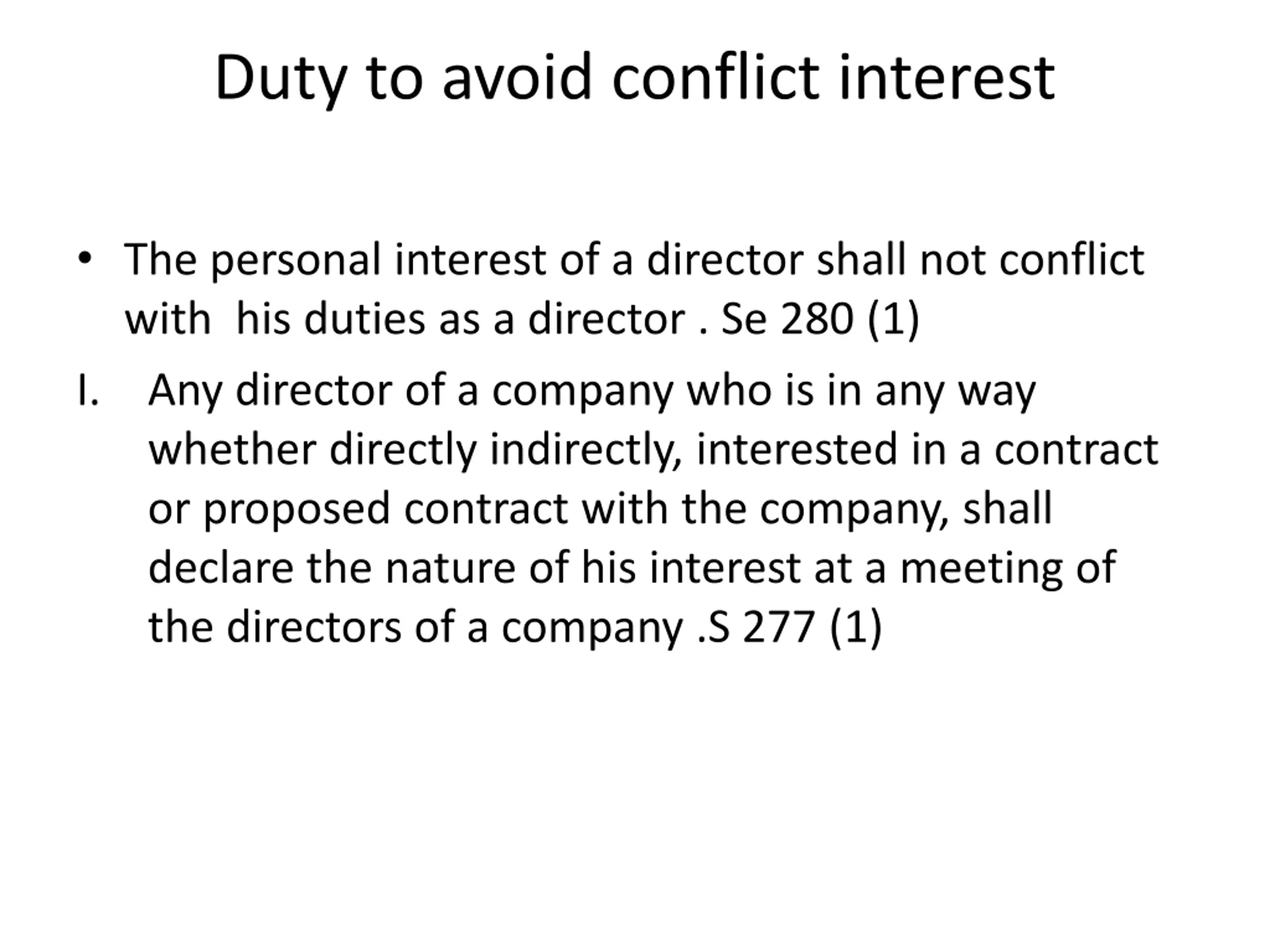 Duty to avoid conflict interest The personal interest of a director shall not conflict with his duties as a director . Se 280 (1) I. Any director of a company who is in any way whether directly indirectly, interested in a contract or proposed contract with the company, shall declare the nature of his interest at a meeting of the directors of a company .S 277 (1)