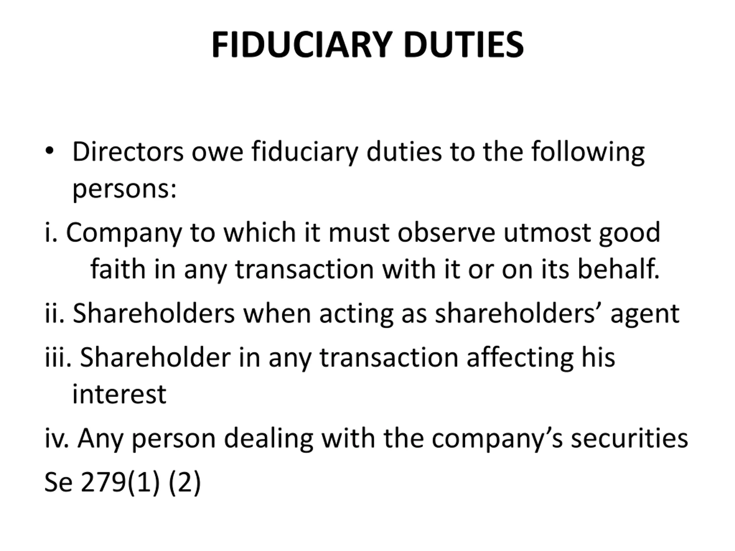 FIDUCIARY DUTIES Directors owe fiduciary duties to the following persons: i. Company to which it must observe utmost good faith in any transaction with it or on its behalf. ii. Shareholders when acting as shareholders agent iii. Shareholder in any transaction affecting his interest iv. Any person dealing with the company s securities Se 279(1) (2)