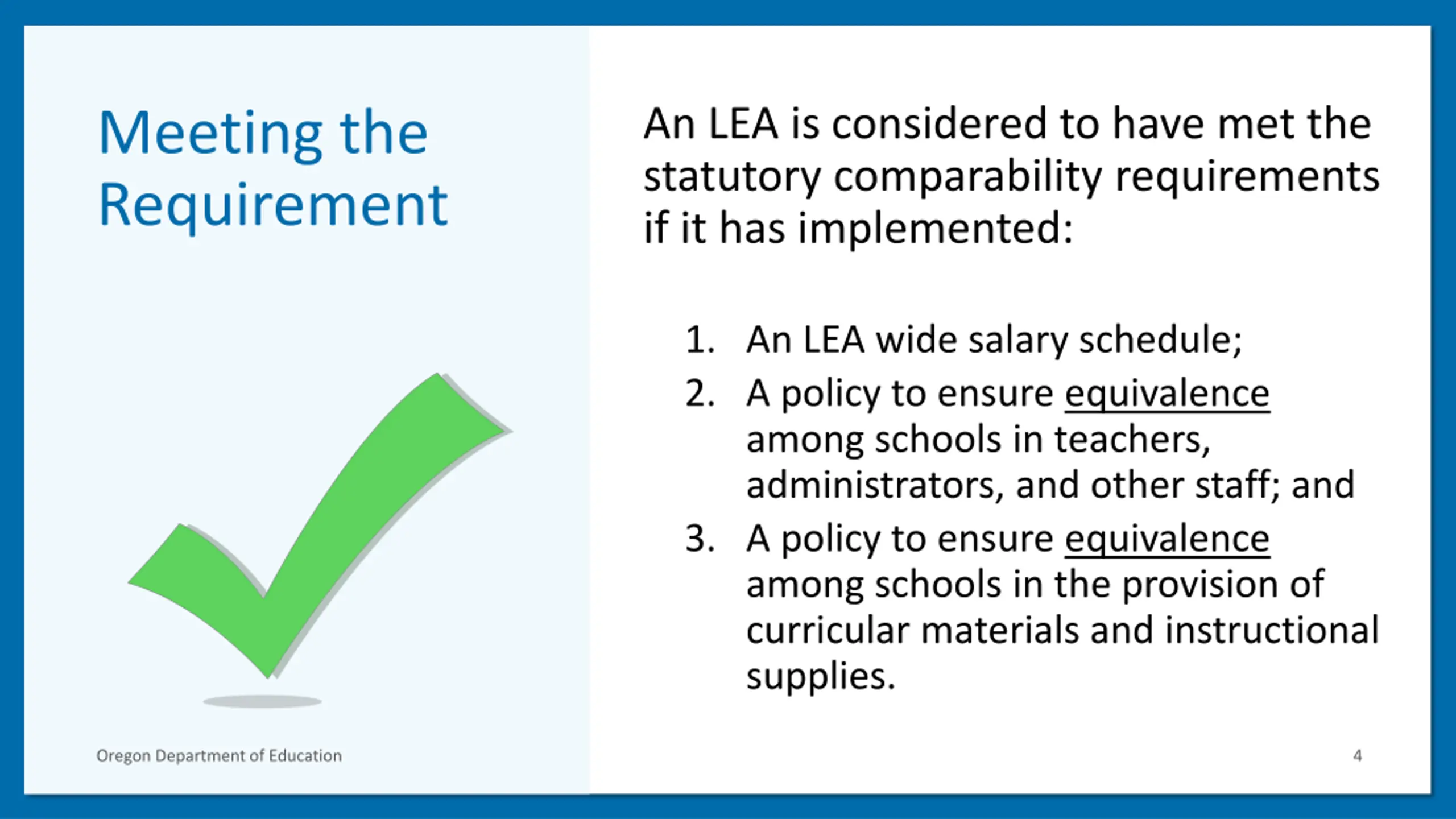 An LEA is considered to have met the statutory comparability requirements if it has implemented: Meeting the Requirement 1. An LEA wide salary schedule; 2. A policy to ensure equivalence among schools in teachers, administrators, and other staff; and 3. A policy to ensure equivalence among schools in the provision of curricular materials and instructional supplies. Oregon Department of Education 4