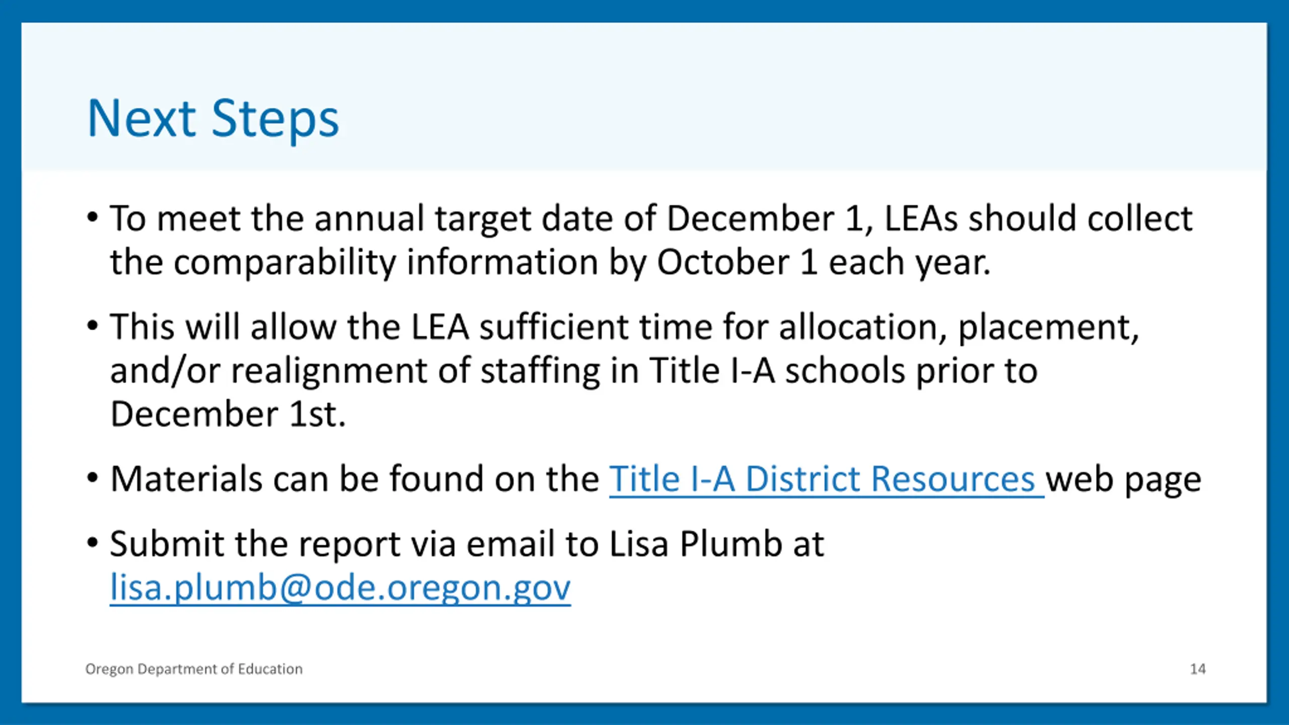 Next Steps To meet the annual target date of December 1, LEAs should collect the comparability information by October 1each year. This will allow the LEA sufficient time for allocation, placement, and/or realignment of staffing in Title I-A schools prior to December 1st. Materials can be found on the Title I-A District Resources web page Submit the report via email to Lisa Plumb at lisa.plumb@ode.oregon.gov Oregon Department of Education 14