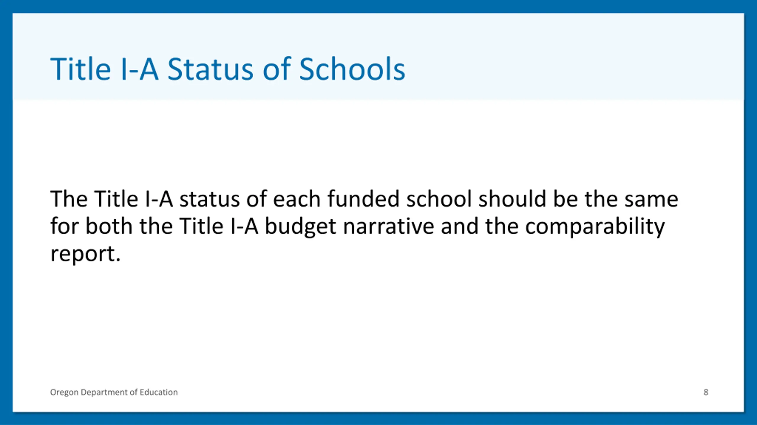 Title I-A Status of Schools The Title I-A status of each funded school should be the same for both the Title I-A budget narrative and the comparability report. Oregon Department of Education 8