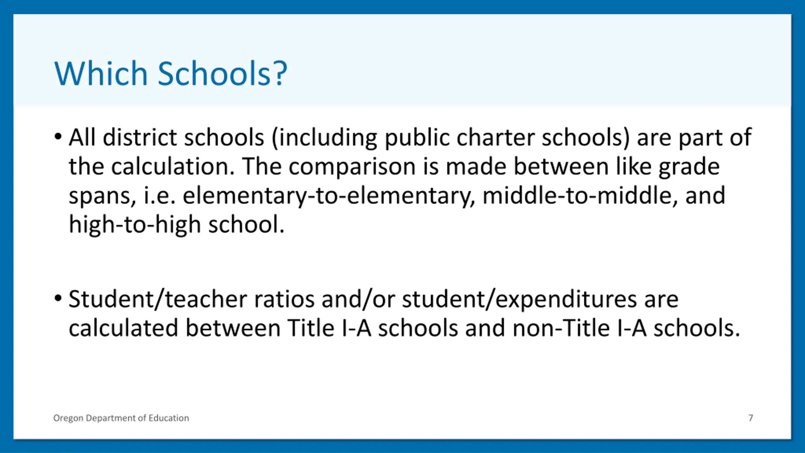 Which Schools? All district schools (including public charter schools) are part of the calculation. The comparison is made between like grade spans, i.e. elementary-to-elementary, middle-to-middle, and high-to-high school. Student/teacher ratios and/or student/expenditures are calculated between Title I-A schools and non-Title I-A schools. Oregon Department of Education 7