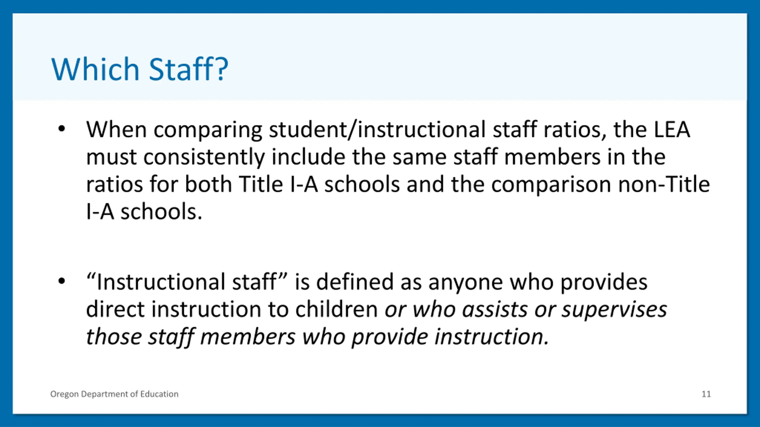 Which Staff? When comparing student/instructional staff ratios, the LEA must consistently include the same staff members in the ratios for both Title I-A schools and the comparison non-Title I-A schools. Instructional staff is defined as anyone who provides direct instruction to children or who assists or supervises those staff members who provide instruction. Oregon Department of Education 11