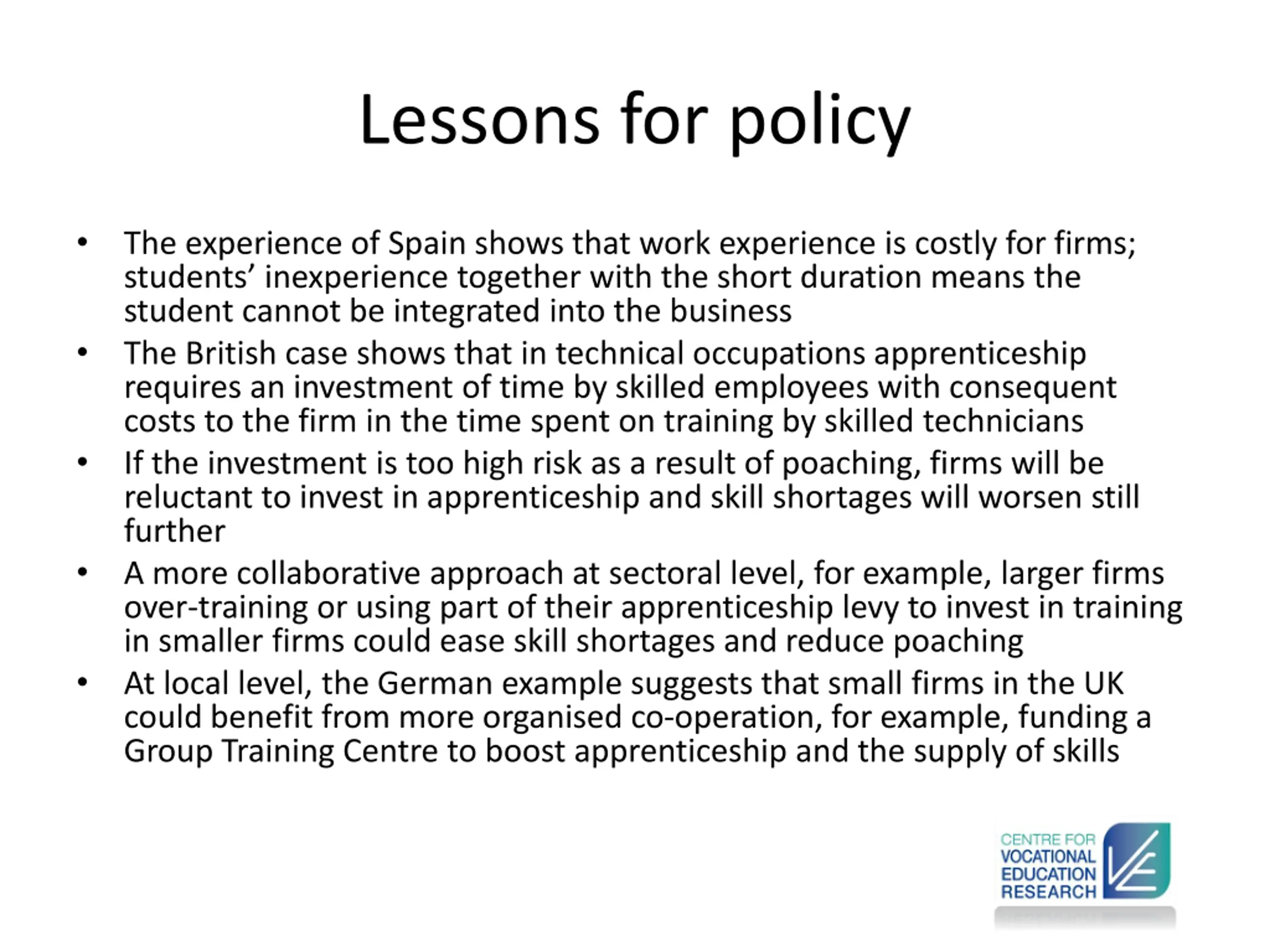 Lessons for policy The experience of Spain shows that work experience is costly for firms; students inexperience together with the short duration means the student cannot be integrated into the business The British case shows that in technical occupations apprenticeship requires an investment of time by skilled employees with consequent costs to the firm in the time spent on training by skilled technicians If the investment is too high risk as a result of poaching, firms will be reluctant to invest in apprenticeship and skill shortages will worsen still further A more collaborative approach at sectoral level, for example, larger firms over-training or using part of their apprenticeship levy to invest in training in smaller firms could ease skill shortages and reduce poaching At local level, the German example suggests that small firms in the UK could benefit from more organised co-operation, for example, funding a Group Training Centre to boost apprenticeship and the supply of skills