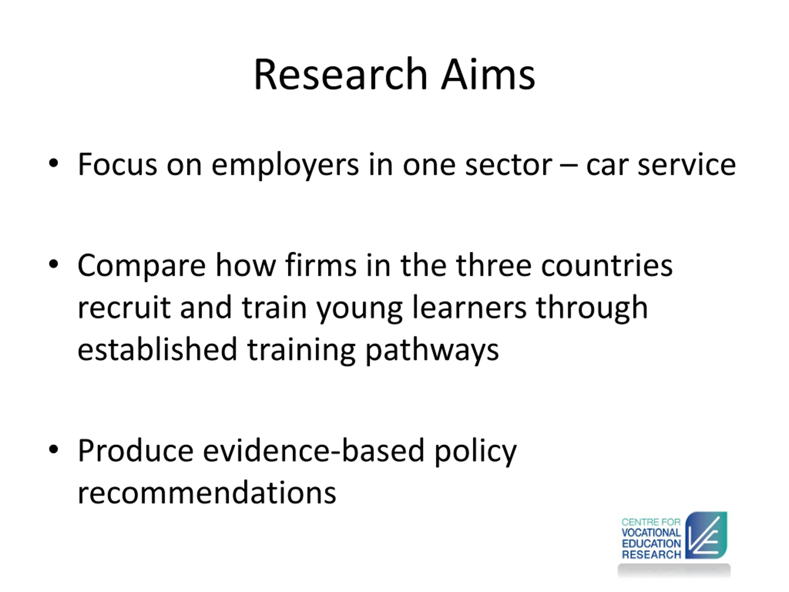 Research Aims Focus on employers in one sector car service Compare how firms in the three countries recruit and train young learners through established training pathways Produce evidence-based policy recommendations