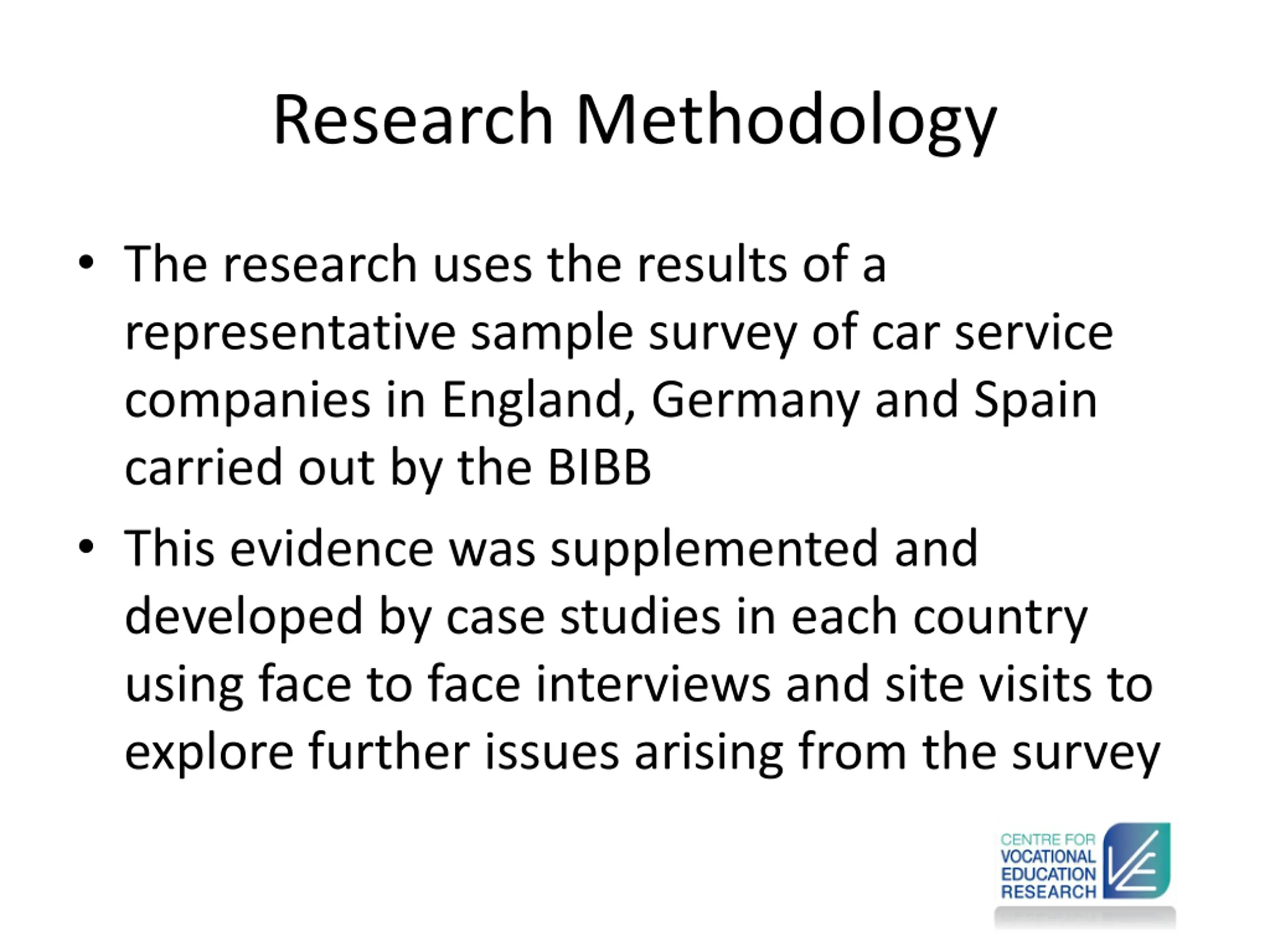 Research Methodology The research uses the results of a representative sample survey of car service companies in England, Germany and Spain carried out by the BIBB This evidence was supplemented and developed by case studies in each country using face to face interviews and site visits to explore further issues arising from the survey