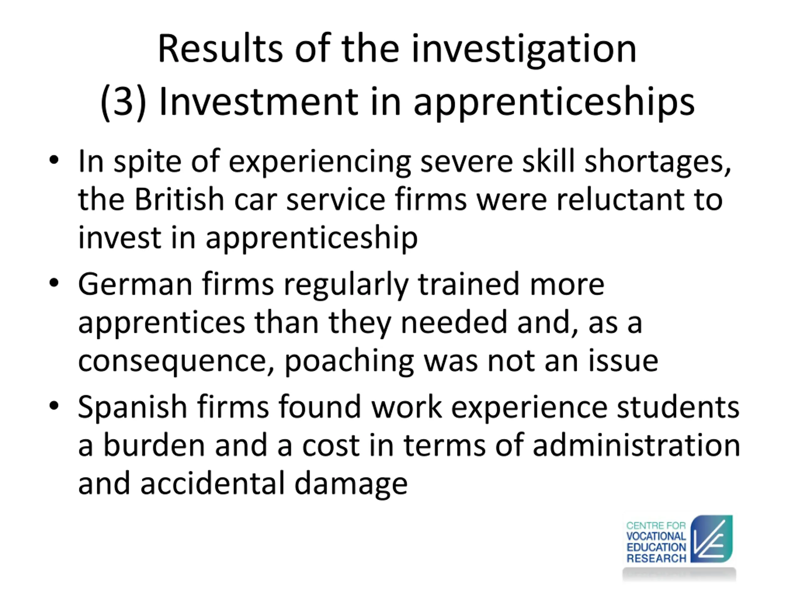 Results of the investigation (3) Investment in apprenticeships In spite of experiencing severe skill shortages, the British car service firms were reluctant to invest in apprenticeship German firms regularly trained more apprentices than they needed and, as a consequence, poaching was not an issue Spanish firms found work experience students a burden and a cost in terms of administration and accidental damage