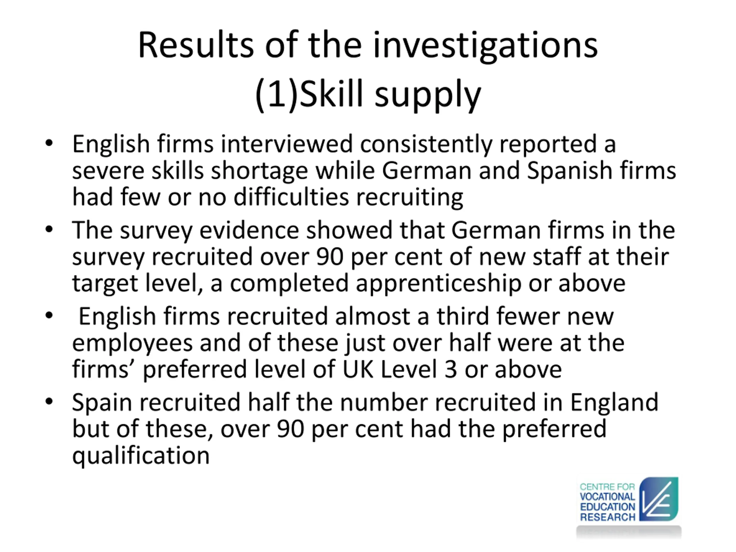 Results of the investigations (1)Skill supply English firms interviewed consistently reported a severe skills shortage while German and Spanish firms had few or no difficulties recruiting The survey evidence showed that German firms in the survey recruited over 90 per cent of new staff at their target level, a completed apprenticeship or above English firms recruited almost a third fewer new employees and of these just over half were at the firms preferred level of UK Level 3 or above Spain recruited half the number recruited in England but of these, over 90 per cent had the preferred qualification