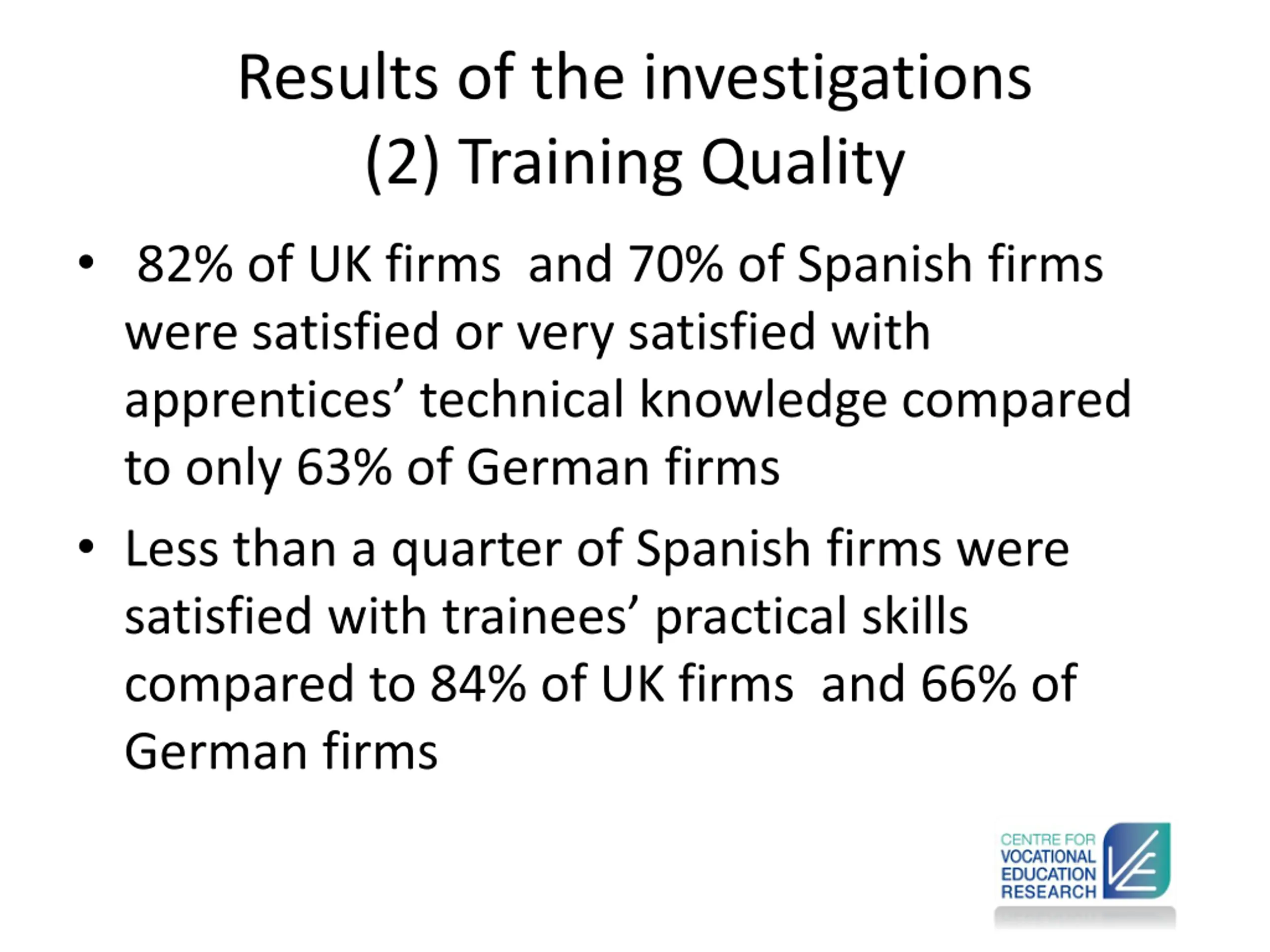 Results of the investigations (2) Training Quality 82% of UK firms and 70% of Spanish firms were satisfied or very satisfied with apprentices technical knowledge compared to only 63% of German firms Less than a quarter of Spanish firms were satisfied with trainees practical skills compared to 84% of UK firms and 66% of German firms