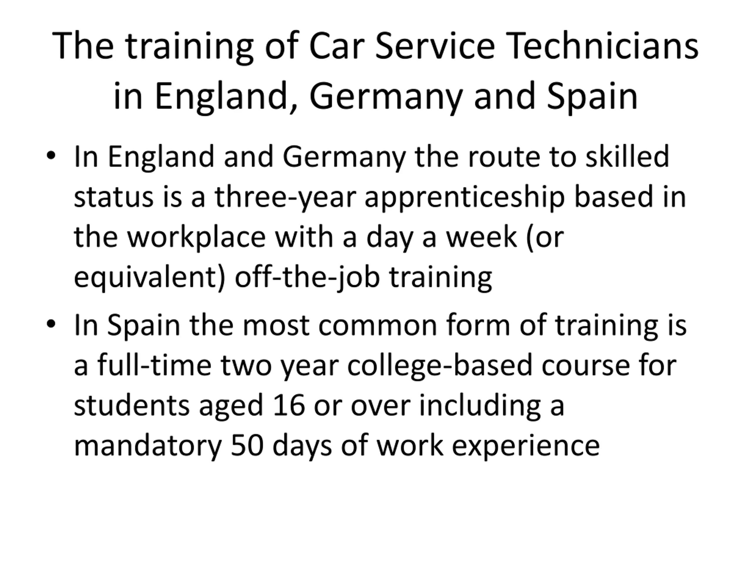 The training of Car Service Technicians in England, Germany and Spain In England and Germany the route to skilled status is a three-year apprenticeship based in the workplace with a day a week (or equivalent) off-the-job training In Spain the most common form of training is a full-time two year college-based course for students aged 16 or over including a mandatory 50 days of work experience