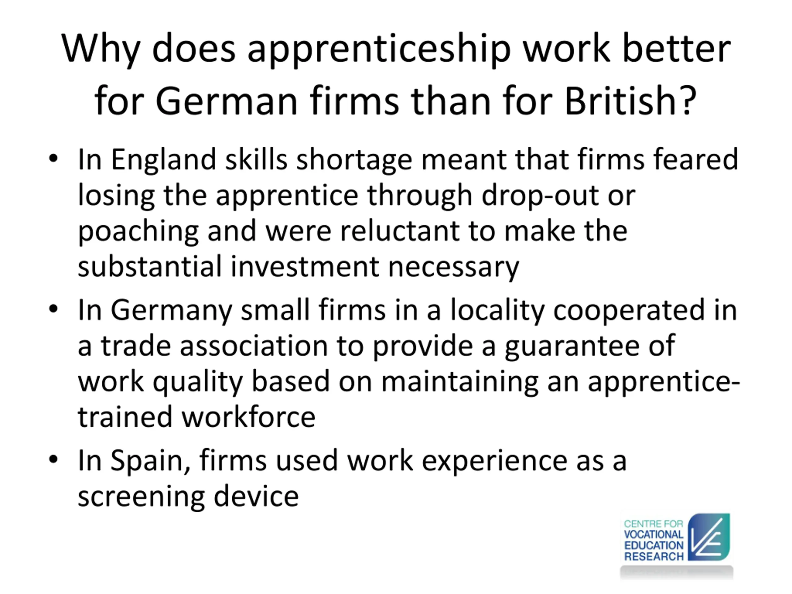 Why does apprenticeship work better for German firms than for British? In England skills shortage meant that firms feared losing the apprentice through drop-out or poaching and were reluctant to make the substantial investment necessary In Germany small firms in a locality cooperated in a trade association to provide a guarantee of work quality based on maintaining an apprentice- trained workforce In Spain, firms used work experience as a screening device