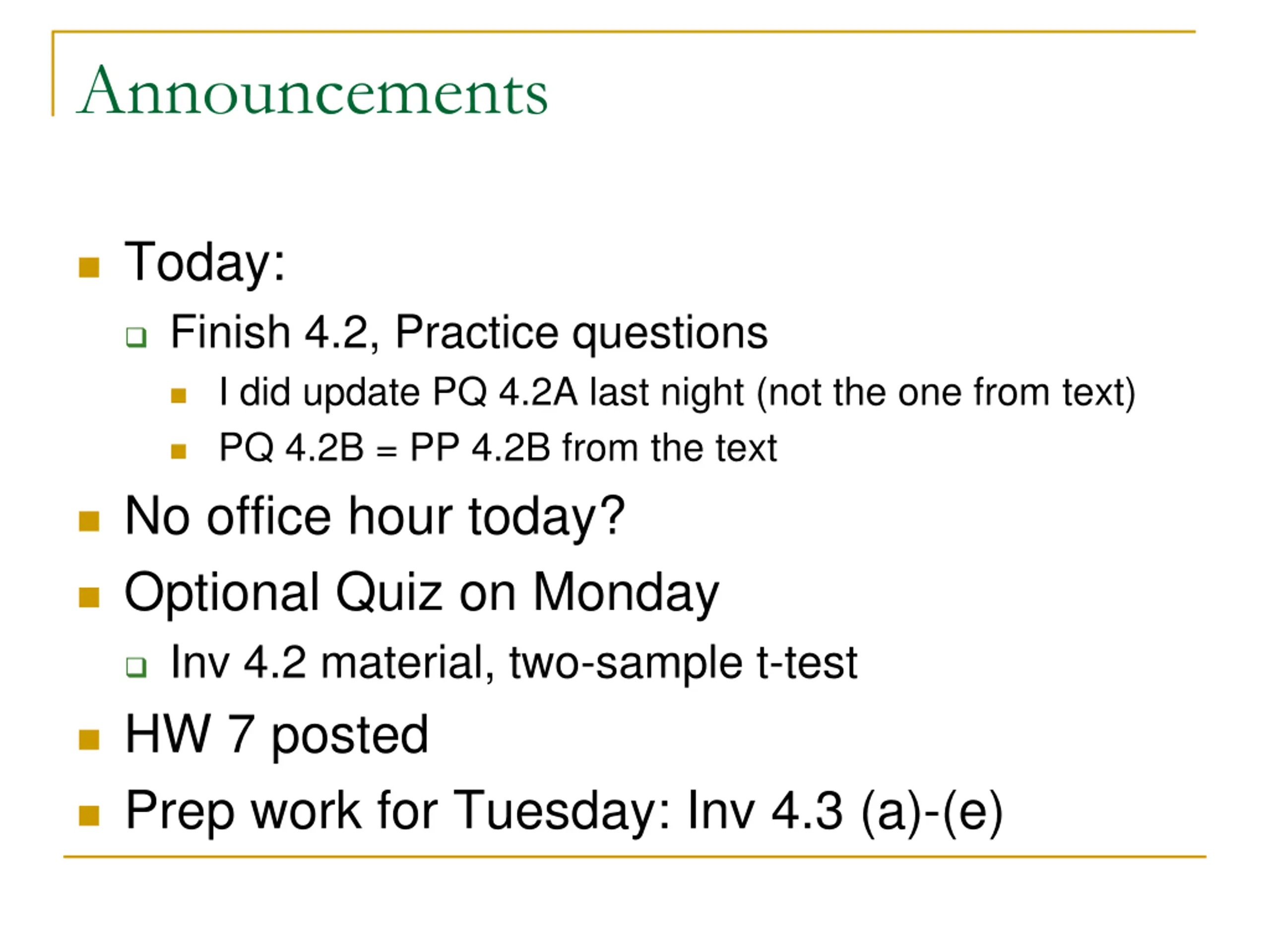 Announcements Today: Finish 4.2, Practice questions I did update PQ 4.2A last night (not the one from text) PQ 4.2B = PP 4.2B from the text No office hour today? Optional Quiz on Monday Inv 4.2 material, two-sample t-test HW 7 posted Prep work for Tuesday: Inv 4.3 (a)-(e)