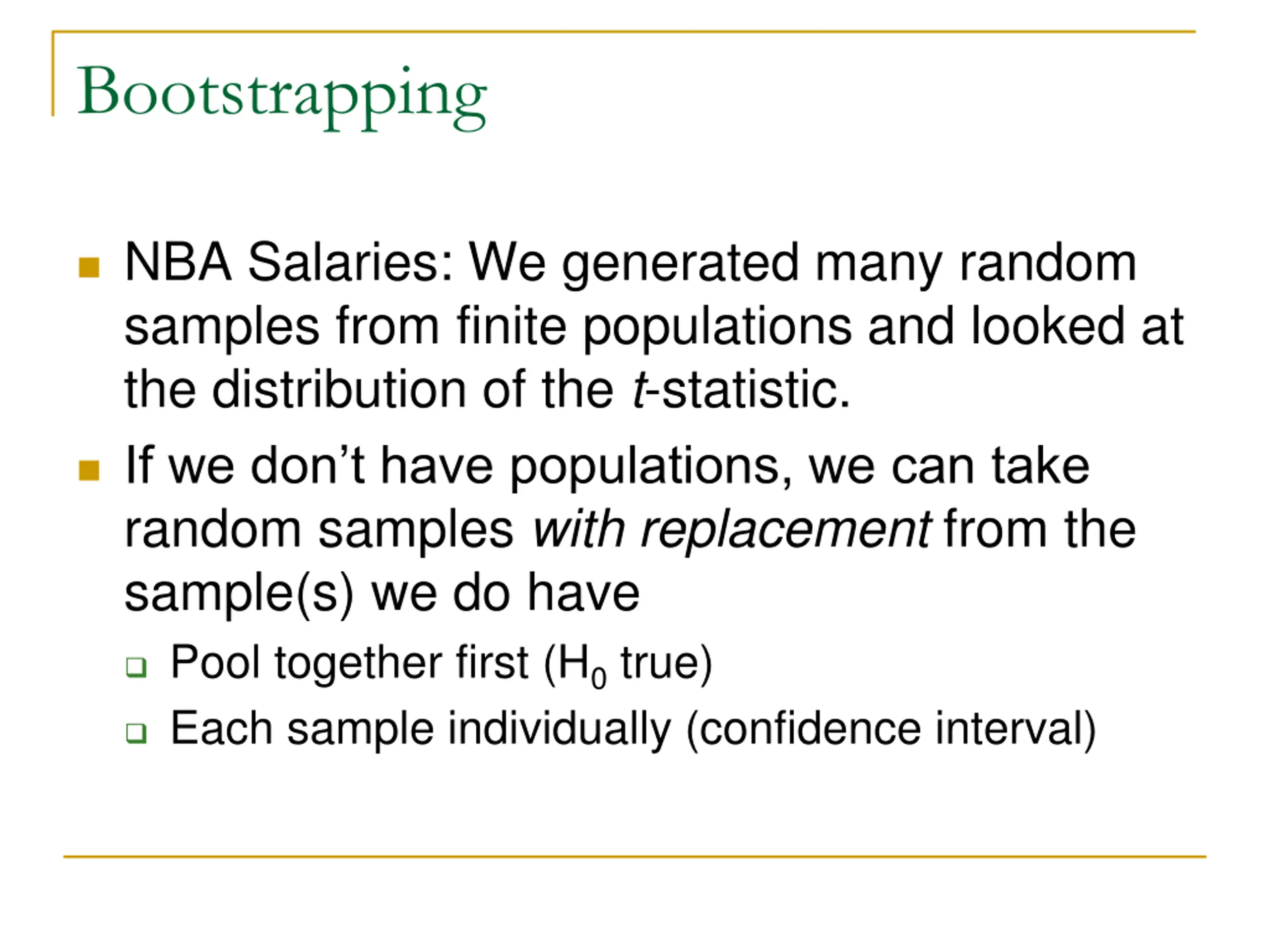 Bootstrapping NBA Salaries: We generated many random samples from finite populations and looked at the distribution of the t-statistic. If we don t have populations, we can take random samples with replacement from the sample(s) we do have Pool together first (H0 true) Each sample individually (confidence interval)